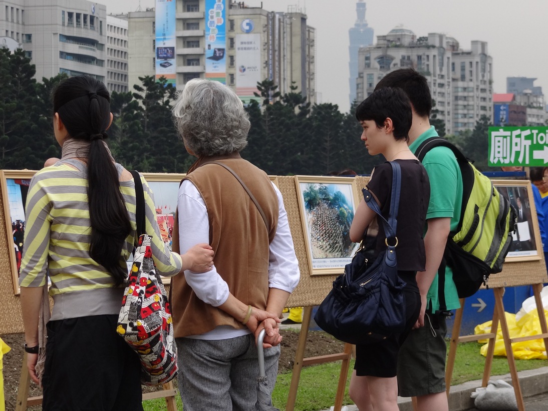 一扫几天的阴霾,正式排法像这天,阳光普照,自由广场上的游客如织,许多路过的大陆游客,围观在法轮功的真相图片展前,兴致勃勃地聊了起来。正聊得热络的时候,其中一人手指着图片中的人物激动地说:“是李洪志大师。”
