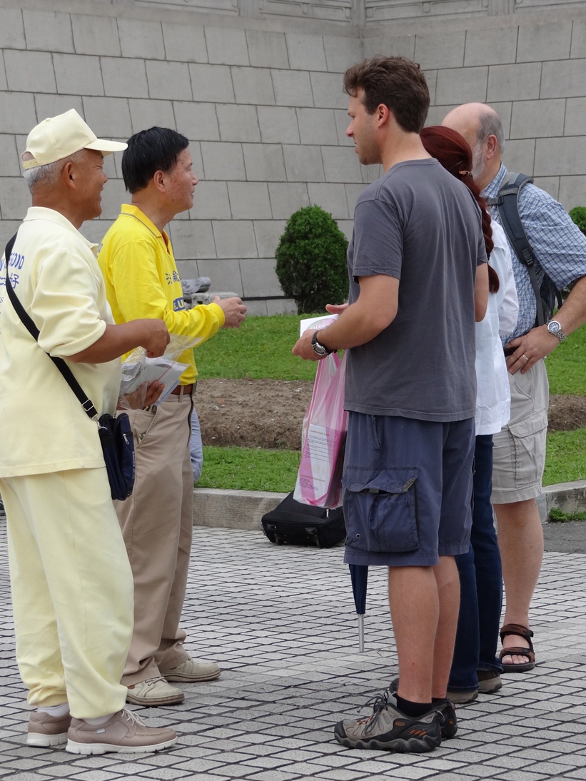 来自屏东的傅秀真在自由广场前亲切微笑,问候大陆游客,并讲述法轮功的真相。有许多大陆民众高兴地回应她,并和她打招呼,其中一位中年妇人默默专注聆听傅秀真讲真相劝三退(退出中共党、团、队,简称三退),笑眯眯地点头同意傅秀真帮她取化名退党。有一位大陆游客在上车前告诉傅秀真,他在日月潭以及其它的景点,已看过许多法轮功的真相资料,他已明白真相并同意退党。