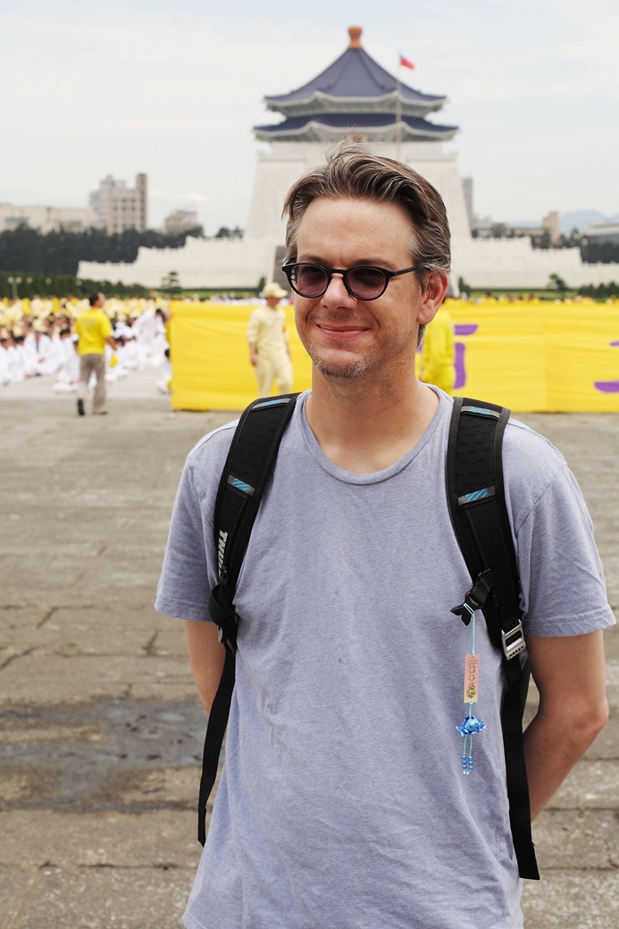 自由广场牌楼下,一位西方人时而站起来拍照,时而坐在那儿静静观看,他说,“我在清华大学做中国宗教研究的博士论文,法轮大法是主要研究之一。”他的名字叫安瑞恩(英文名:Ryan John Taylor Adams),是美国加州大学圣塔芭芭拉分校宗教系博士生,七年前知道法轮功,他认为大法很好,应该在各地都能够自由学炼法轮功才对,例如在大陆。他知道法轮大法不是宗教而是修炼,这种修炼对人们的生命有很正向的助益。他还表示,“我每天打坐半个小时,炼四十五分钟动功。炼功让我感到很平和沉静、充满能量,精神集中。”