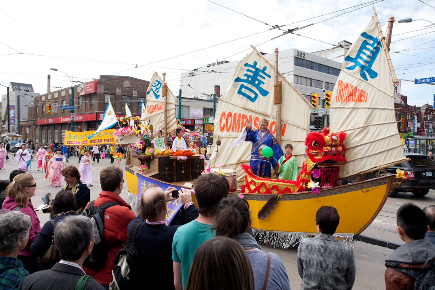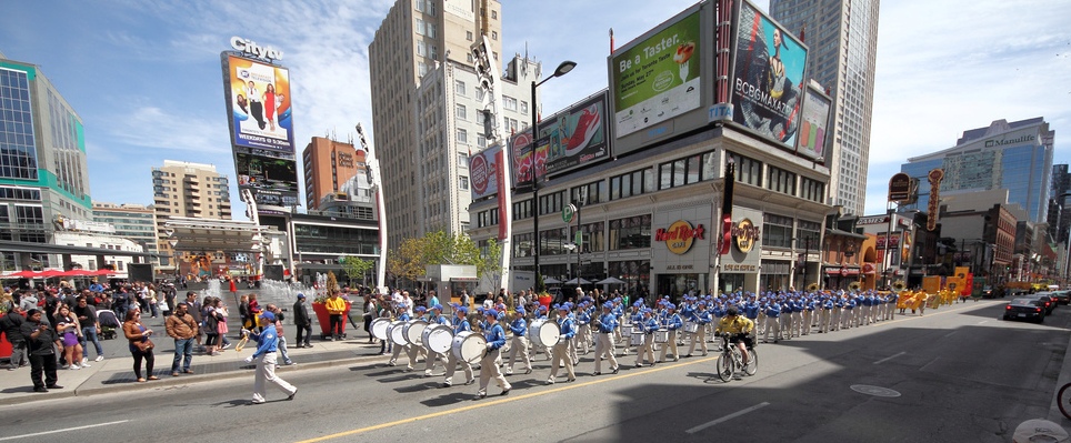 当日多伦多晴空万里,游行队伍由一百多人组成的天国乐团打头阵,乐团成员一路高奏《送宝》、《法鼓法号震十方》、《法正乾坤》,庄严雄壮的鼓乐驱散了层层阴霾,随后而来的是“大法船”花车和手捧莲花的粉装仙女们,超凡的气势带给人心灵震撼,观众纷纷驻足拍照留念。
