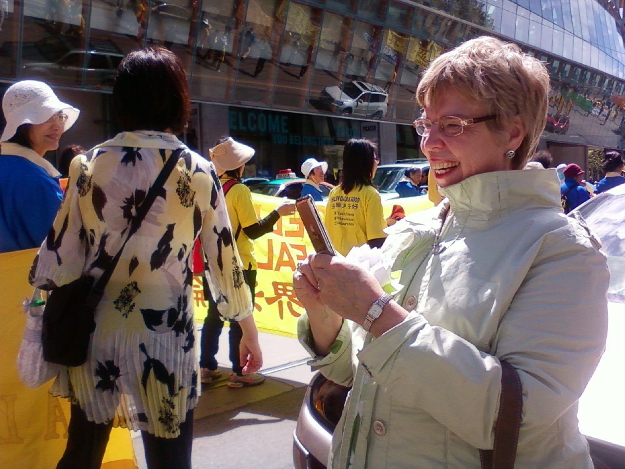 来自加东Brantford市的Sandra Street 看着游行队伍就不停地感叹:“真美啊!美极了!(So Beautiful!So wonderful!)”,激动地说:“我还得到了一朵小莲花,上面有‘法轮大法’的网址,我一定回去好好看看。你看看这个队伍多美好,令人非常震撼的感觉,我感觉到有很大的能量。”