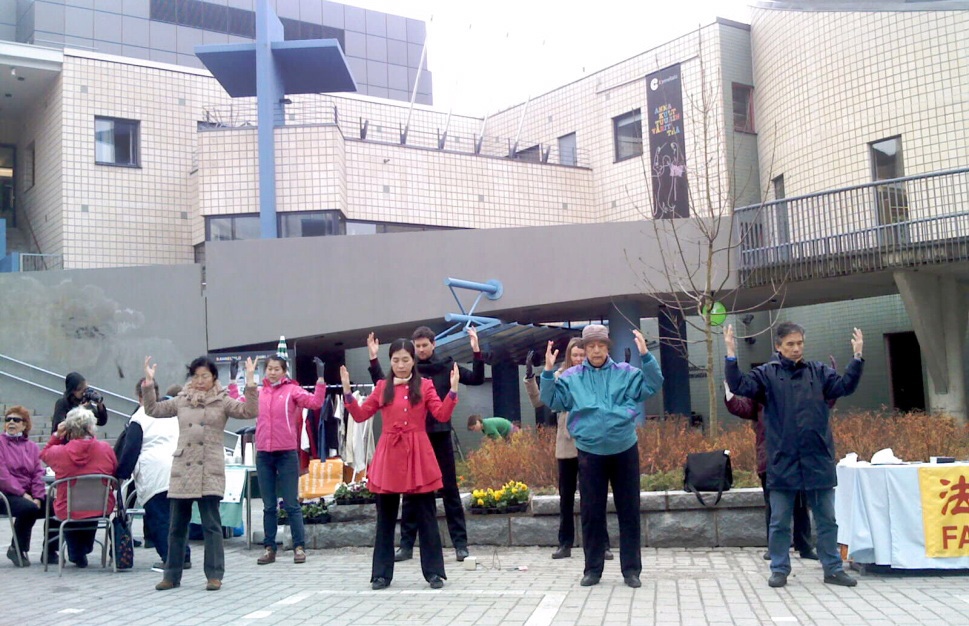 现在芬兰已经进入春天的季节,金黄色“法轮大法好”横幅悬挂在摊位前,法轮功学员随着悠扬的炼功音乐,演示着五套功法。附近十几家商家的工作人员与途经的民众纷纷驻足观看,有的民众跟着学员的炼功动作,兴致勃勃地学了起来。有两位年轻的芬兰女孩学完五套功法后,她们还详细地问了法轮功在芬兰的炼功点,要了大法网站资料后,才依依不舍地离开。