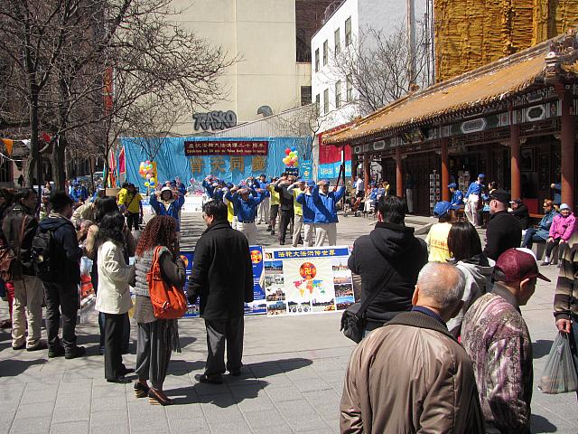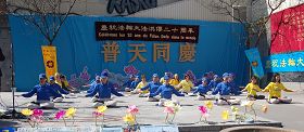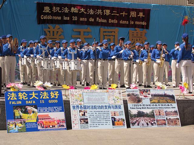 活动现场多幅巨型展板、法轮功学员的集体炼功以及天国乐队精彩演奏吸引了许多人驻足观看,仔细了解真相。