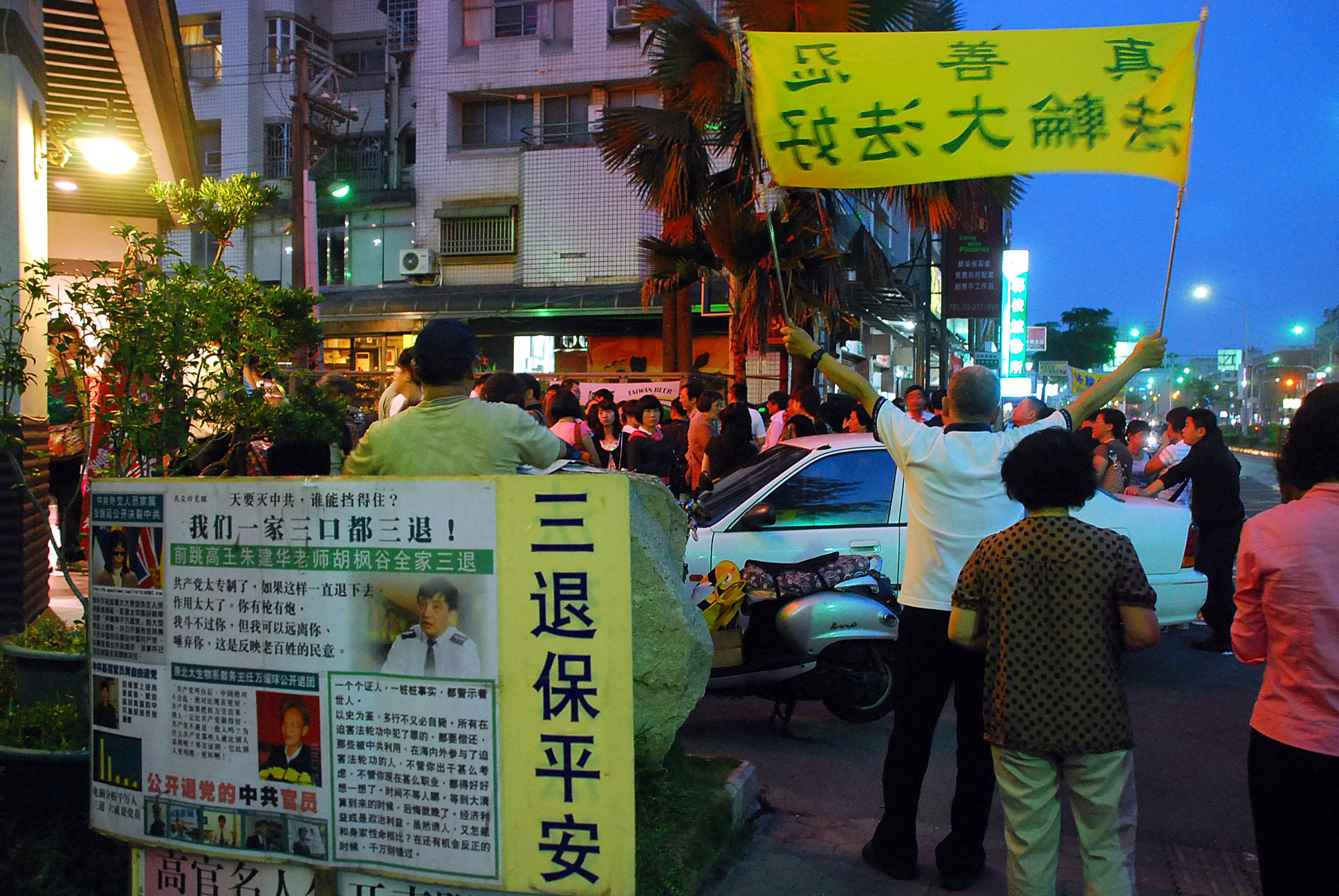 嘉义法轮功学员在“蜜月馆”餐厅前向来台湾旅游的中国游客讲真相