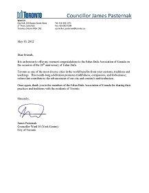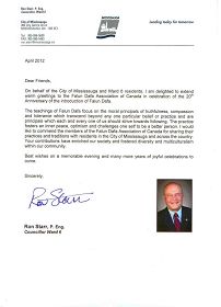 【明慧网二零一二年五月九日】在全球大法弟子庆祝第十三届“世界法轮大法日”,法轮功创始人李洪志师父的六十一华诞,以及法轮大法洪传二十周年庆典之际,加拿大多位市议员发来贺信,称赞“真善忍”理念超越单一信仰,感谢法轮大法为加拿大带来美好,宁静和乐观的精神,同时向法轮功修炼者们表示衷心的祝贺。