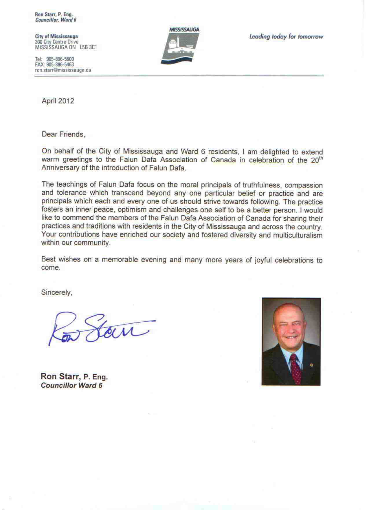 密西沙加第六区市议员Ron Starr在贺信中说:“在法轮大法传世20周年庆典之际,我很高兴的代表米西沙家市和第6市选区的居民们,向加拿大法轮大法协会致以热烈的祝贺。