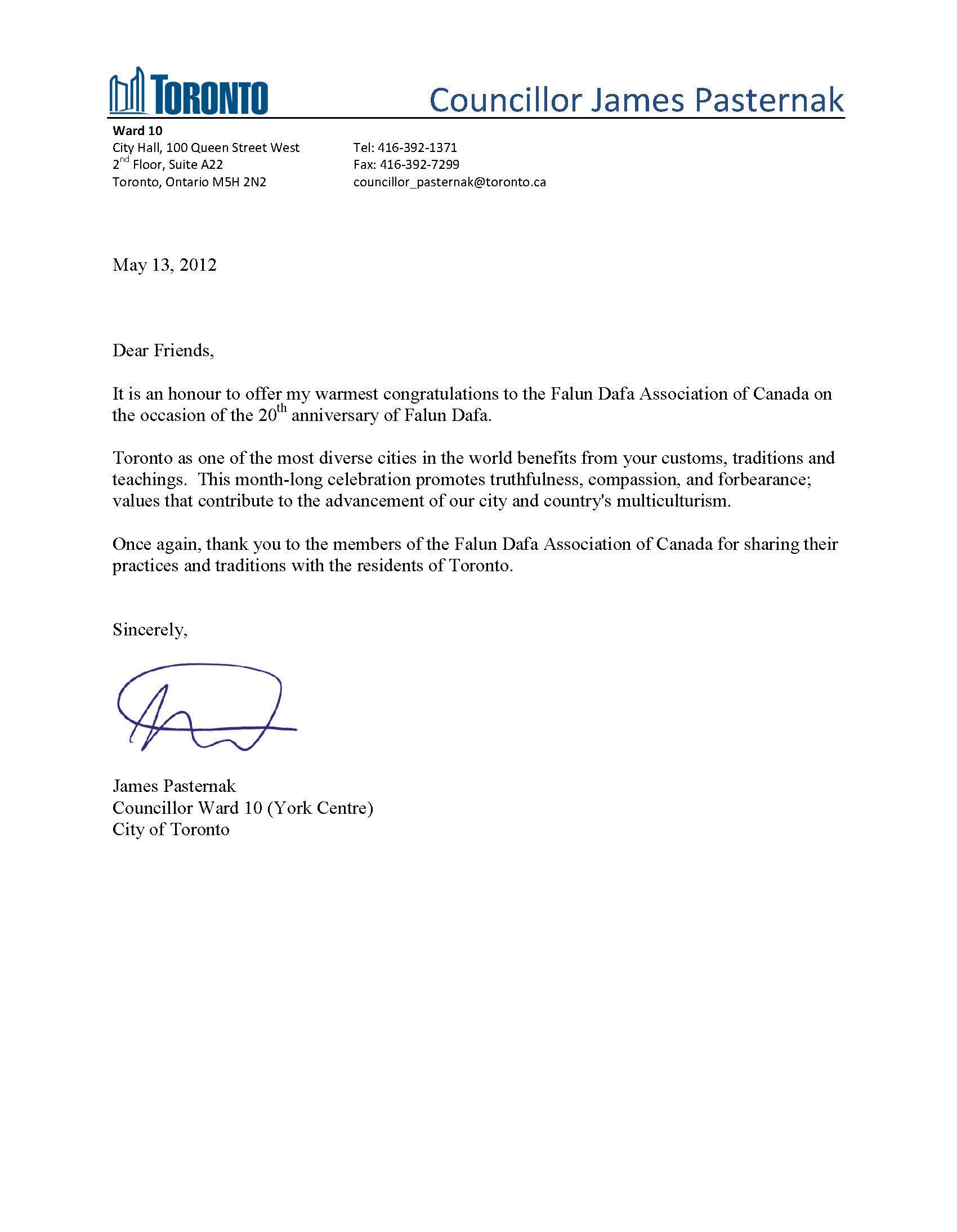 York Center市第十区市议员帕斯特纳(James Pasternak)在贺信中表示:“亲爱的朋友们,在法轮大法传世20周年之际,我很荣幸的向加拿大法轮大法协会致以最热烈的祝贺。