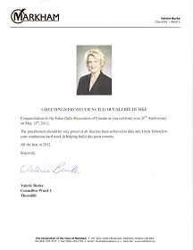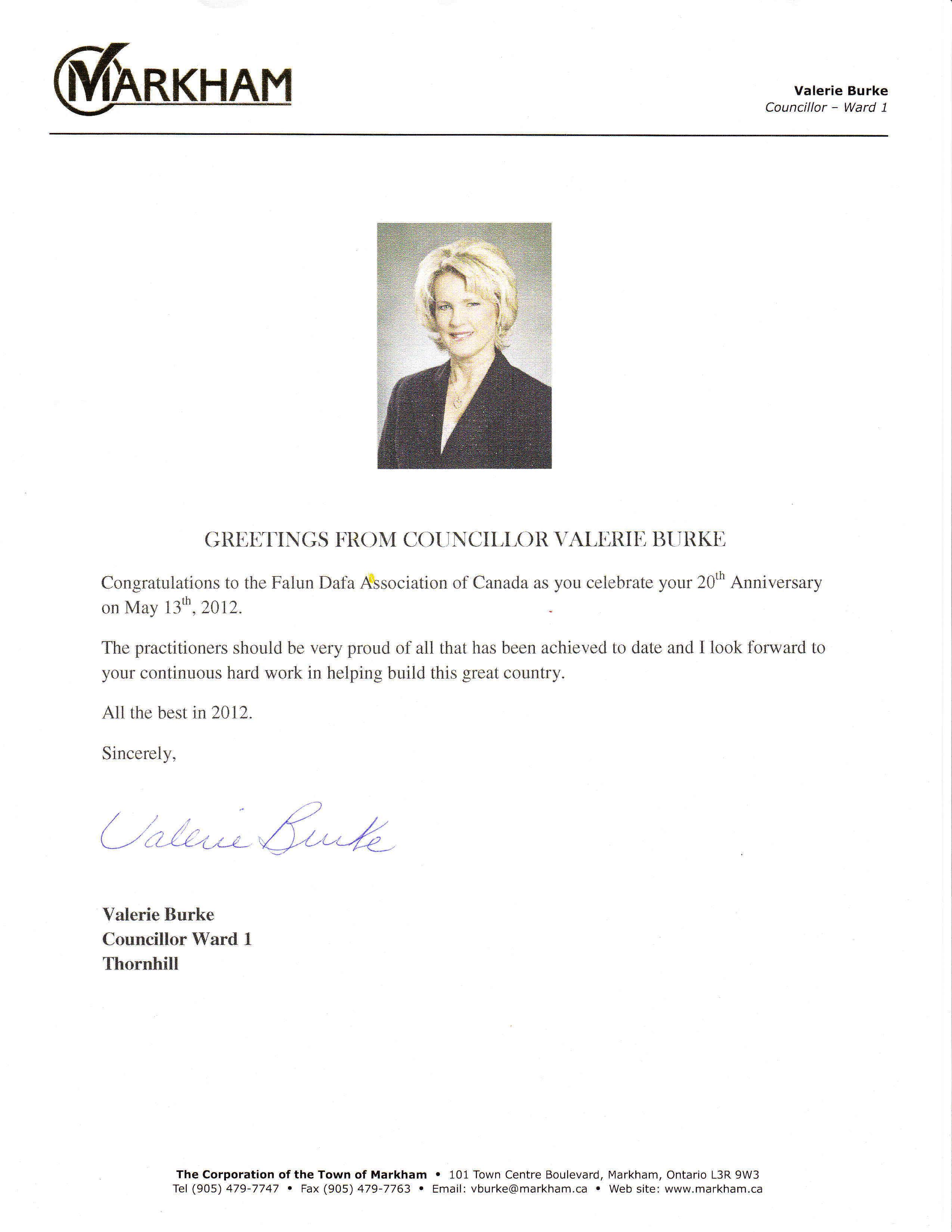 Markham 市议员Valerie Burke在贺词中说:“在你们欢庆法轮大法开传二十周年之际特向加拿大法轮大法协会发出祝贺。每一个大法修炼者应该为你们迄今所开创的而自豪,我期望着你们继续努力, 把我们加拿大建设成一个伟大的国家。”