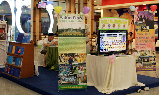 【明慧网二零一二年五月九日】五月十三日是世界法轮大法日,今年是法轮大法在全世界洪传二十周年,为了庆祝这个日子,印尼泗水市法轮功学员在一市内超级商场设立展位,告诉当地民众大法的美好,及弘传世界的盛况。