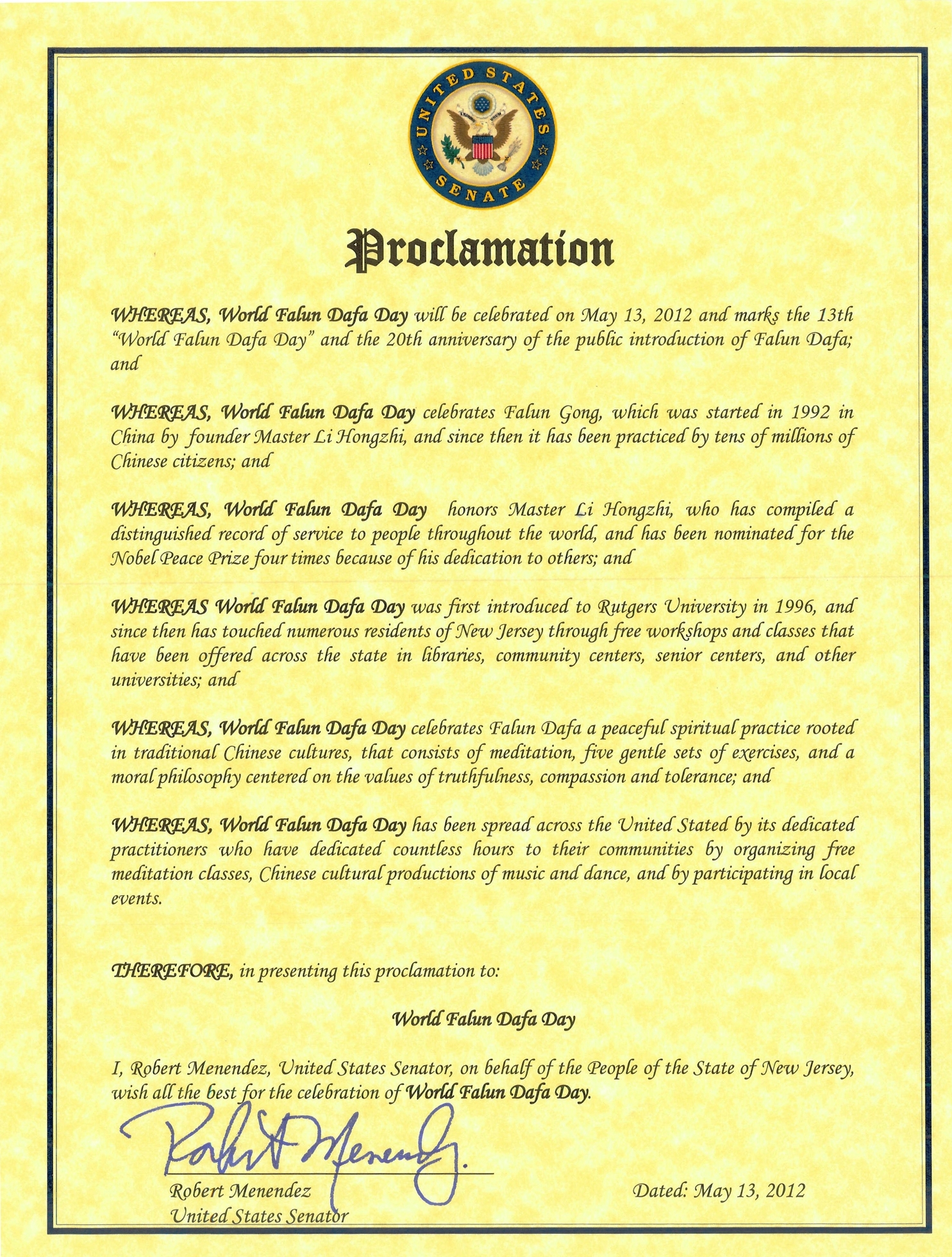 因此,我—罗伯特•梅南德斯,美国参议员,代表新泽西居民将这项褒奖授予“世界法轮大法日”,并向“世界法轮大法日”的庆祝活动致以最美好的祝愿。