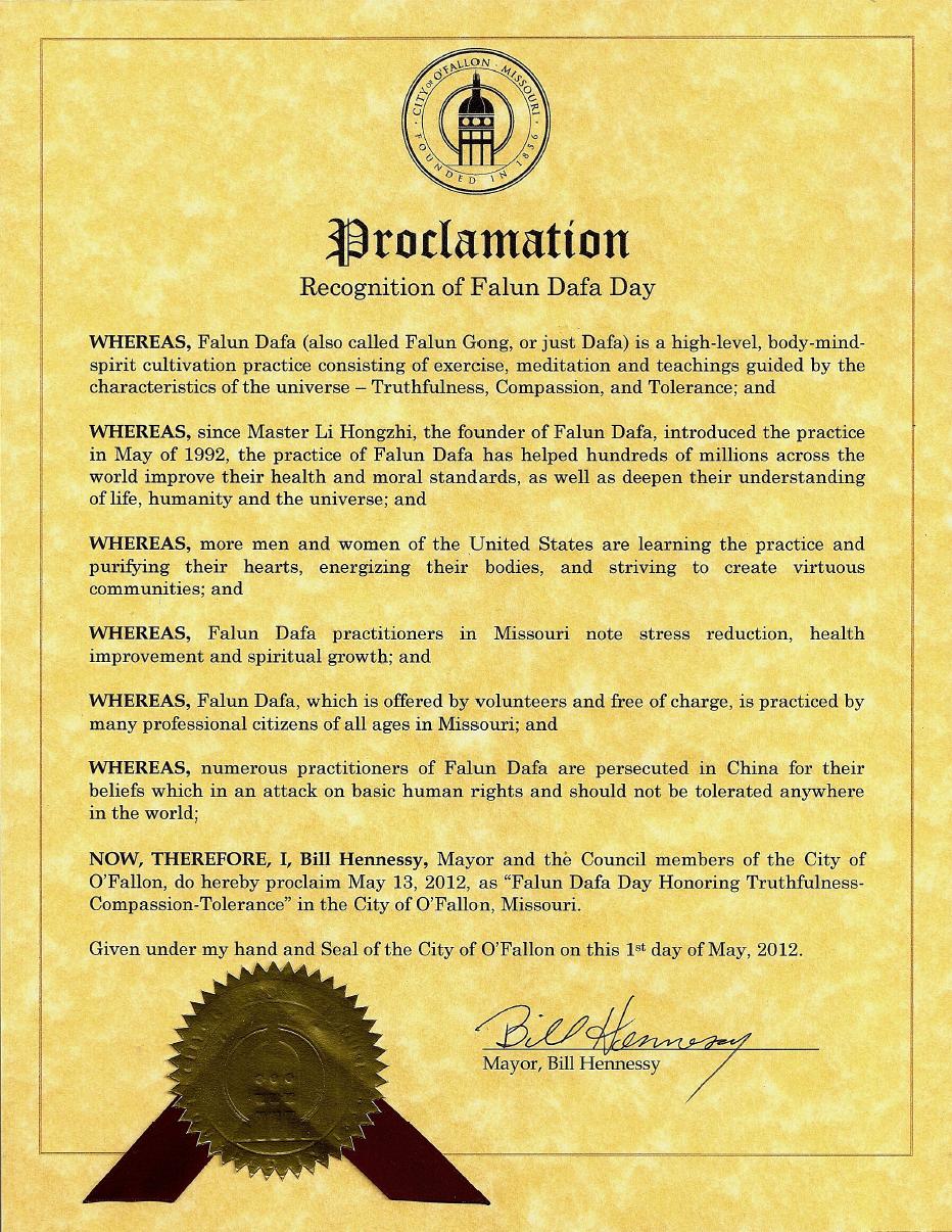 【明慧网二零一二年五月九日】美国密苏里州奥法伦市(O'Fallon)市长比尔•海内斯(Bill Hennessy)于二零一二年五月一日颁发褒奖令,褒奖法轮大法,宣告二零一二年五月十三日为密苏里州奥法伦市市“颂扬真、善、忍的法轮大法日”。