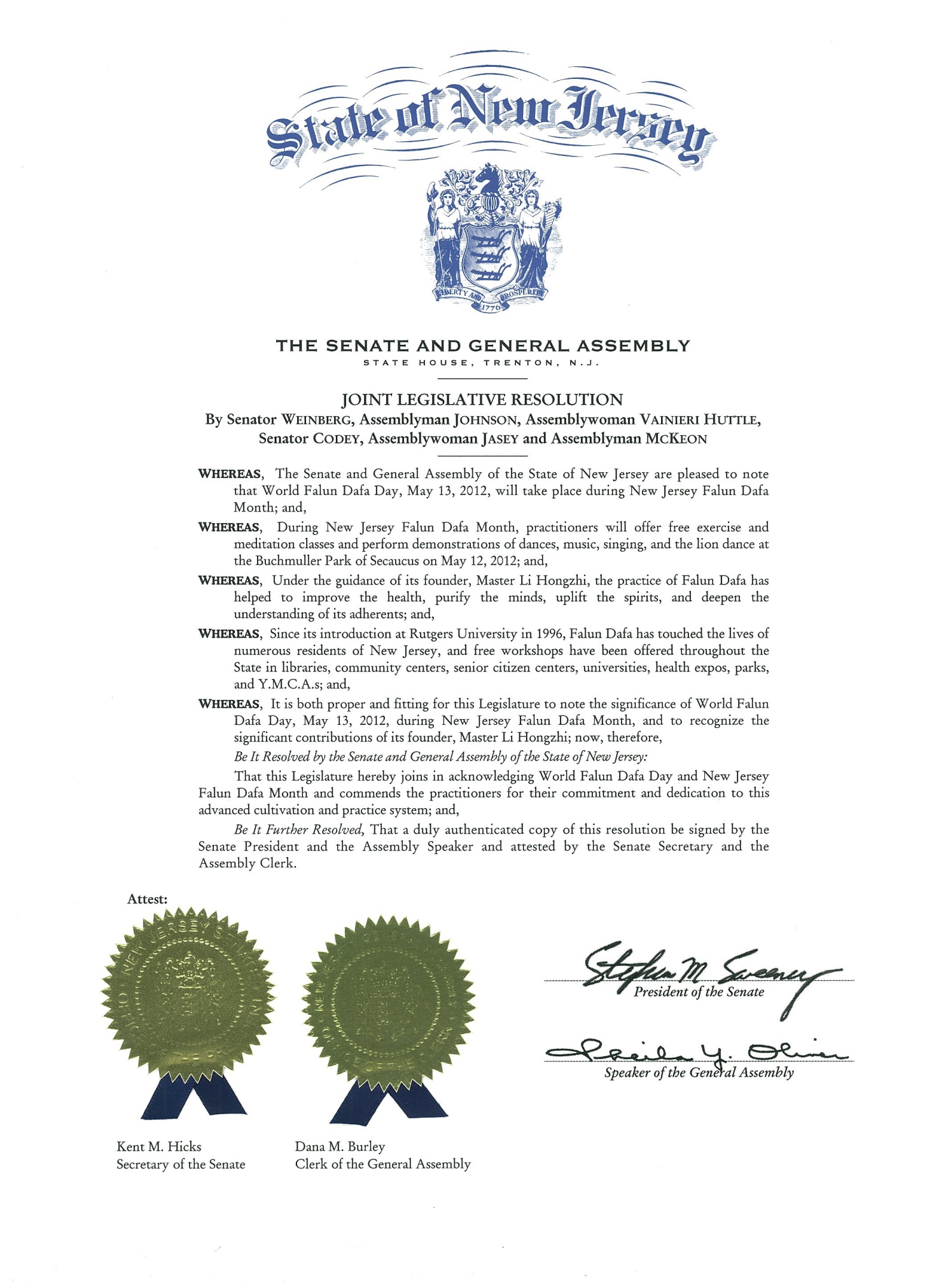 鉴于,自从一九九六年首次在罗格斯特大学介绍法轮大法以来,已经有众多新泽西居民接触法轮大法。免费介绍会遍及全州的图书馆、社区中心、老人中心,大学,健康博览会,公园和YMCA。