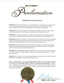 布兰诺市市长费尔•戴尔(Phil Dyer)通过秘书表示自己不能亲自来参加今天的活动,但他对法轮功学员表示祝贺,颁发嘉奖,宣布五月十三日为法轮大法日,赞扬法轮大法提倡的善良、忠诚和忍耐的普世价值。
