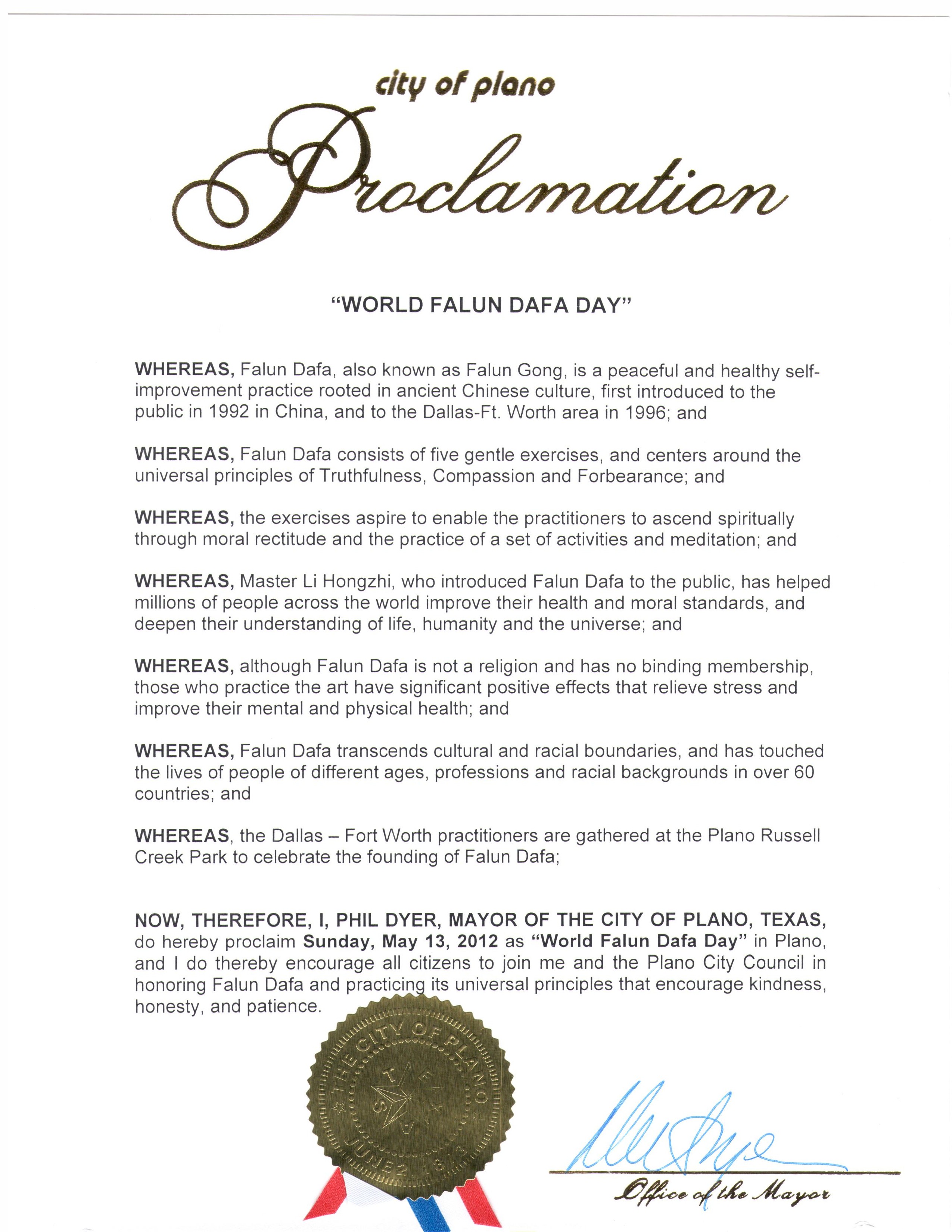 因此,我,费尔•戴尔,作为布兰诺市长声明把二零一二年五月十三日作为布兰诺法轮大法日,并鼓励所有布兰诺居民与我和布兰诺市政委员会一起祝贺法轮大法学员以宇宙原理为准则鼓励慈善,诚实和忍耐。