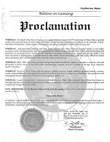 鉴于,能代表Lansing市来纪念法轮大法二十周年是我极大的荣幸。法轮大法是基于中国传统文化遗产、着重于“真善忍”原则这一宇宙美德的精神系统和修德系统;并且