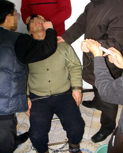 劳教所的管理科长郑海令将李文军的绝食以自伤自残定论,对李文军进行野蛮的强制灌食,将李文军固定在专用的铁椅子上,手脚全身全部固定,一动不能动。然后强行下鼻饲,灌苞米面粥加大量盐。直接插管到胃里,鼻子和胃里出大量的血。