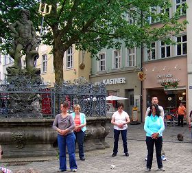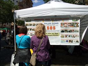 ![]() 法轮功学员们在市中心的步行街上举办真相信息日 |