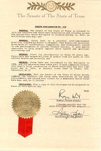 德克萨斯州参议院表彰美南法轮大法学会的成就并对这一难忘的世界大法日给予最美好的祝愿。