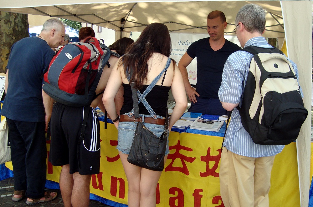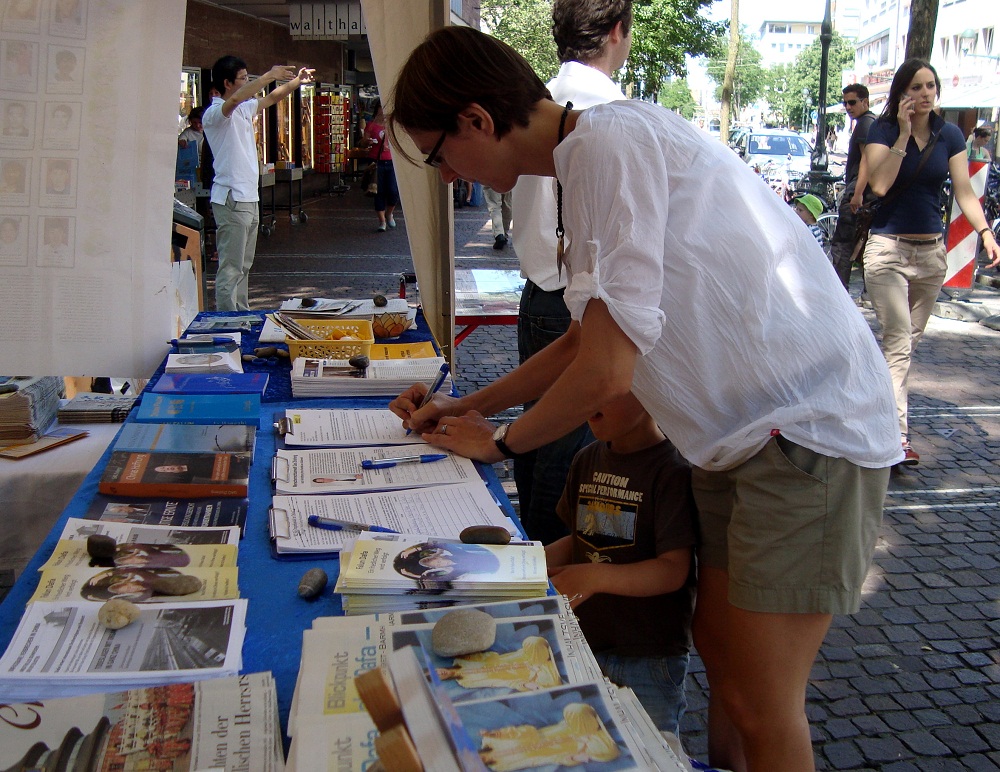 一位女士看到法轮功的信息台,直奔学员而来,询问现在是否有炼功点,原来这位女士十几年前就学过法轮功,后来当地的那位学员离开了弗莱堡,所以她也就中断了炼功,这天她再次遇到了法轮功学员,欣喜之情溢于言表。