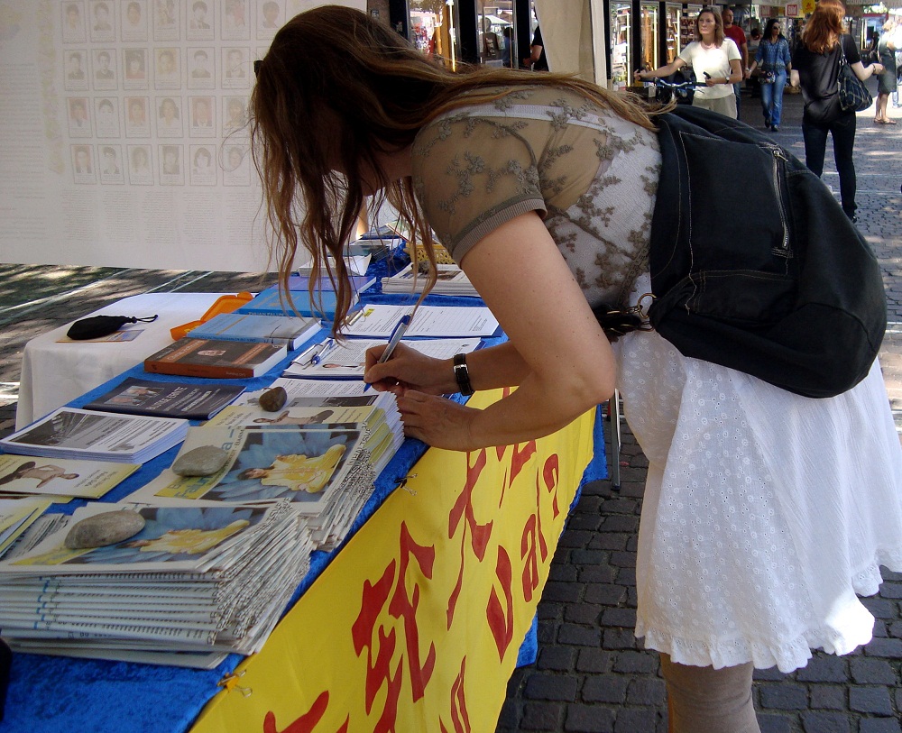 一位年轻的姑娘接过法轮功学员递给她资料时问:“这是什么?”学员告诉她这是介绍法轮功在中国被迫害情况的信息。有成千上万人被关进监狱、劳教所、精神病院,或被迫害得失去工作、流离失所,还有的法轮功学员被活体摘取器官。姑娘问:“我能做些什么呢?”学员指着马路对面的信息台说:我们在征集签名,向各界呼吁制止中共对法轮功学员的迫害。那姑娘穿过马路来到信息台前,郑重地签上了自己的名字。