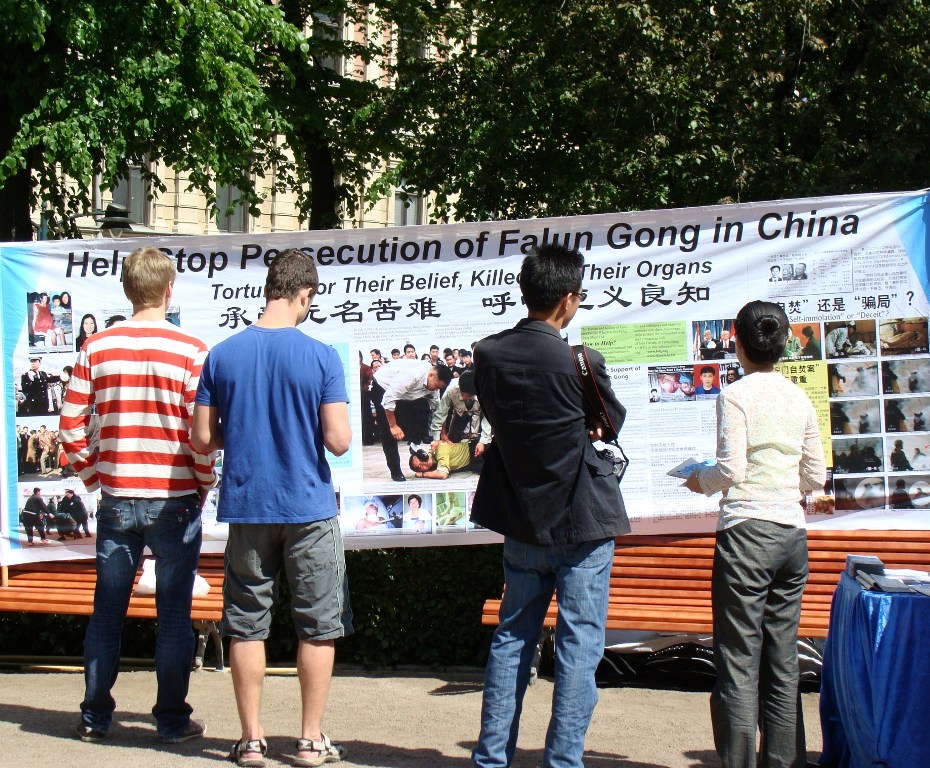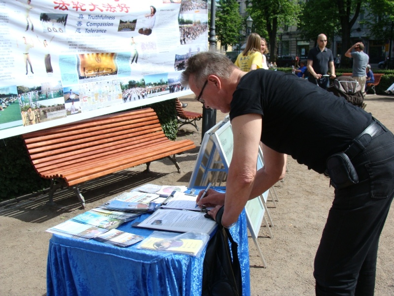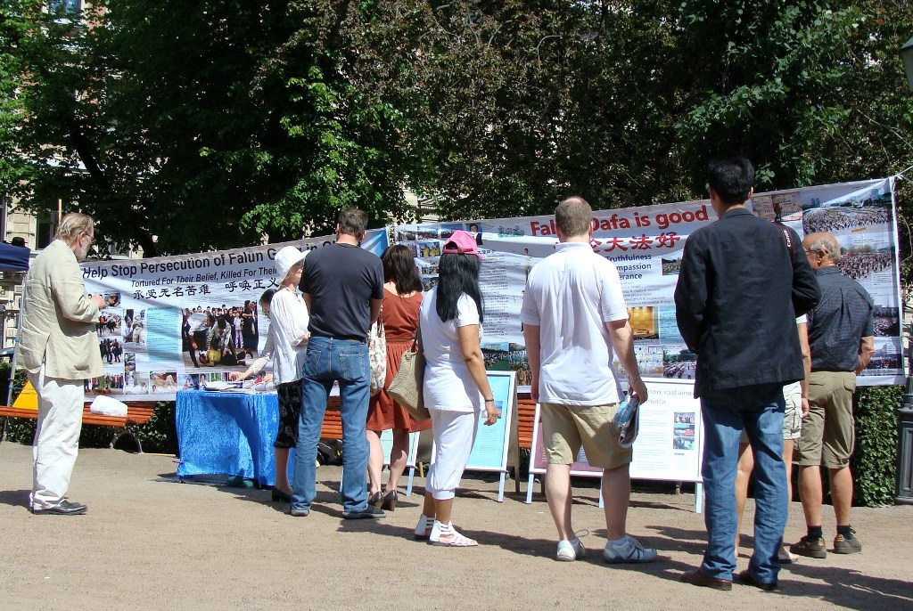 来芬兰旅游的也有不少俄罗斯人,其中有一位父亲带着女儿,女儿差不多四五岁,一看到学员们在一旁演示功法,就静静站在那里。父亲也停了下来,一旁的学员递给那位父亲一份俄语的资料后,并讲解法轮功的功法及迫害的残酷。父亲听得很仔细,小女孩则一直在旁边静静地看着学员们的功法演示。