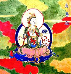 说明:作者曾去中国敦煌石窟和北京附近的一所法海寺庙,并以那里的菩萨画像为蓝本,以矿物质颜料、自然的有机颜色和金,用毛笔在木质的画板(上面有九层粉笔灰和胶水合成的石膏覆盖而成)上绘制此幅画。这是一种起源于拜占庭(小亚细亚)的传统的绘画技法。