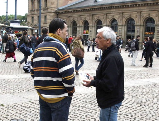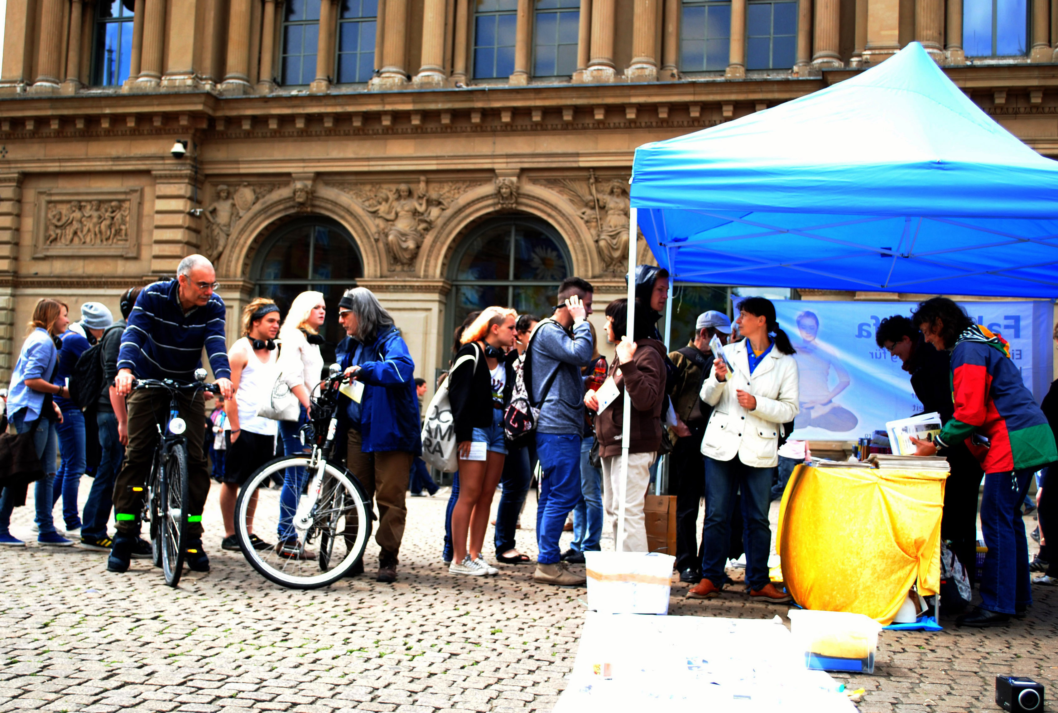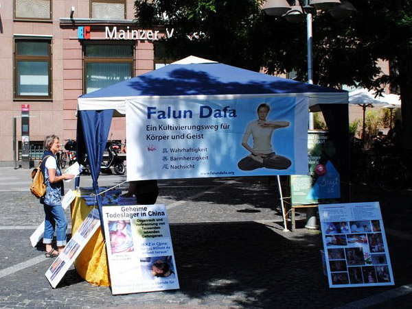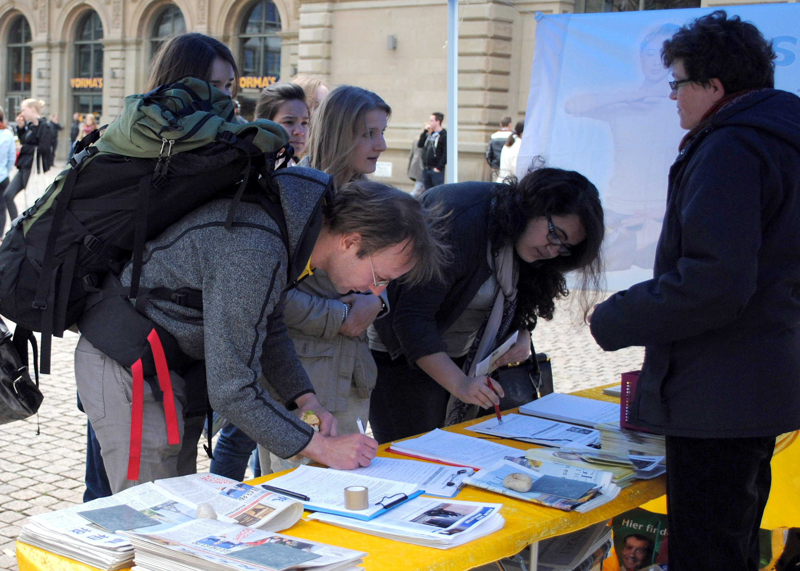 一位四十岁左右的德国男士带着妻子一起来到信息台前了解真相。在签名反迫害后,他告诉学员,他二十年前练过气功,对气功很感兴趣。当了解到法轮大法不是普通的气功,而是更高层次的修炼方法后,更激发了他浓厚的兴趣。他跟太太在信息台前与学员聊了一个多小时后,决定要学法轮功。临走时他要了学员的联系方式,并当场请走了宝书《法轮功》。