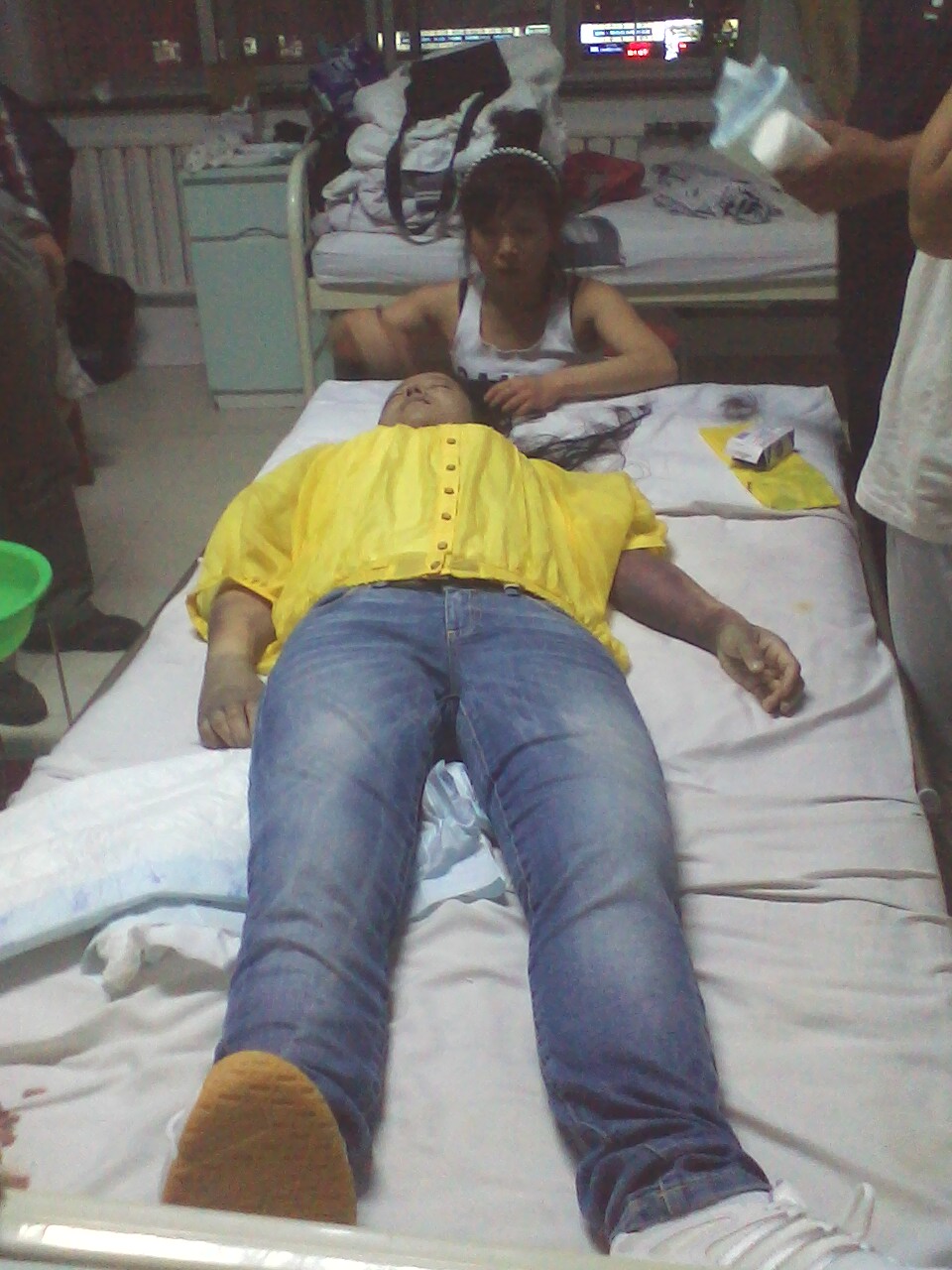 王霞在医院不配合邪恶,她们把王霞的手脚用布条绑在床上下鼻饲灌食,王霞没办法阻止,就憋尿,一天一夜不尿,小腹胀满,陪护告诉大夫,就给插导尿管排尿,乘陪护不在王霞就把导尿管拔了;她们嫌王霞拔管,打、骂一顿后,用更紧的方式把手脚膝盖往上都紧紧勒住,绳子陷在肉里都出血了疼得小腿不敢动,好了以后膝盖上还留下了深色的两道疤痕。(从照片可以看得出那勒紧的伤痕)
