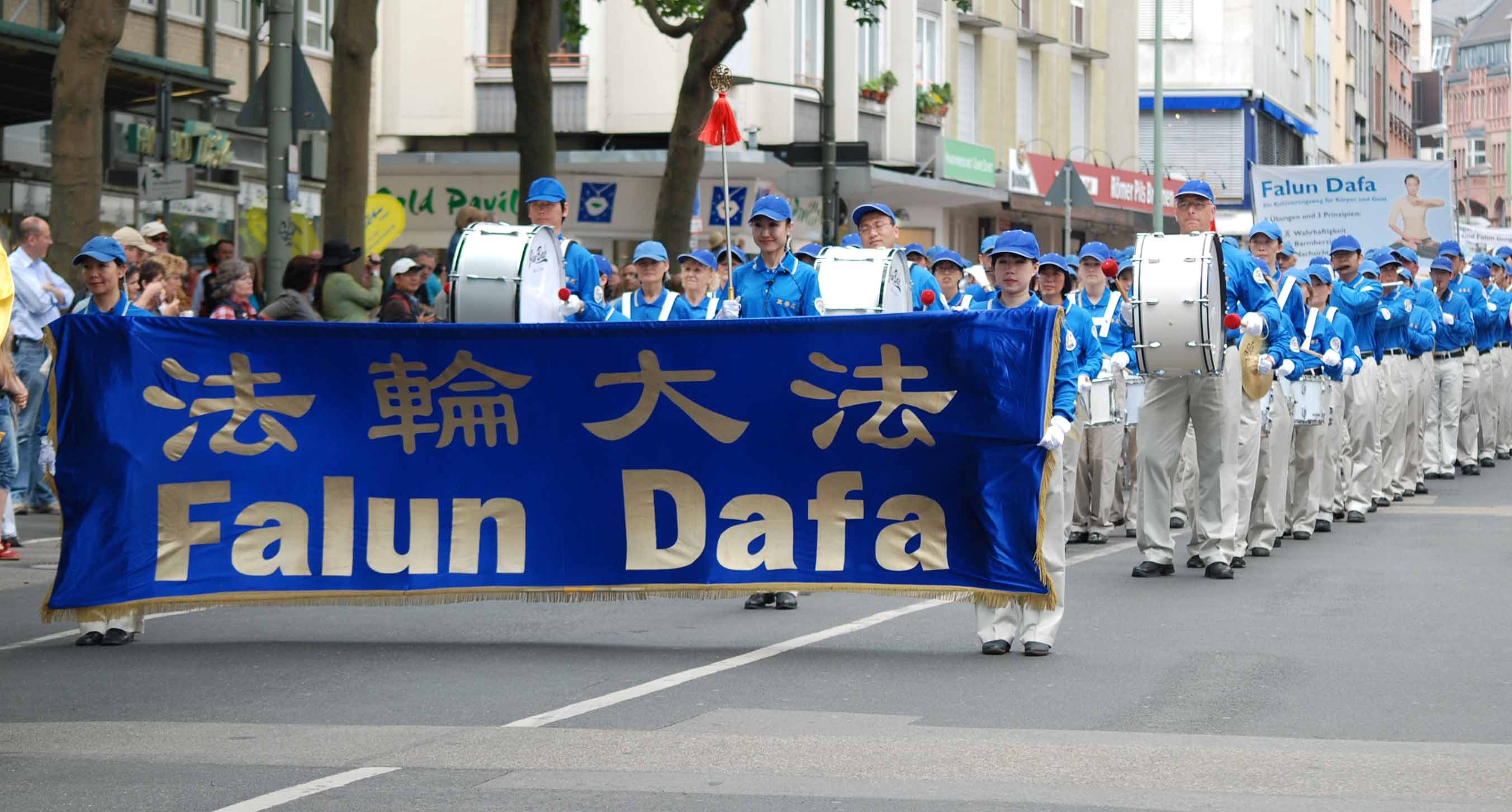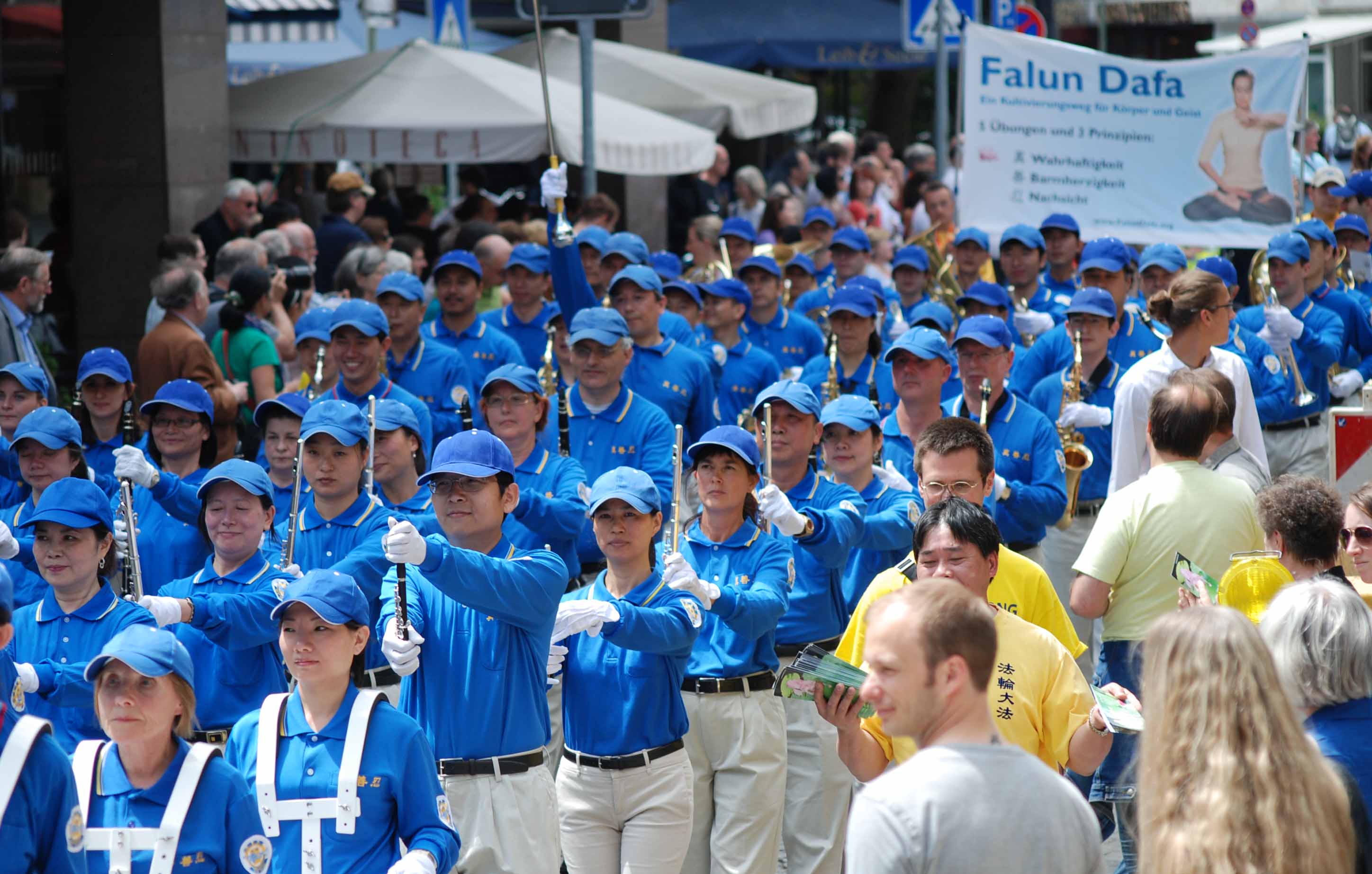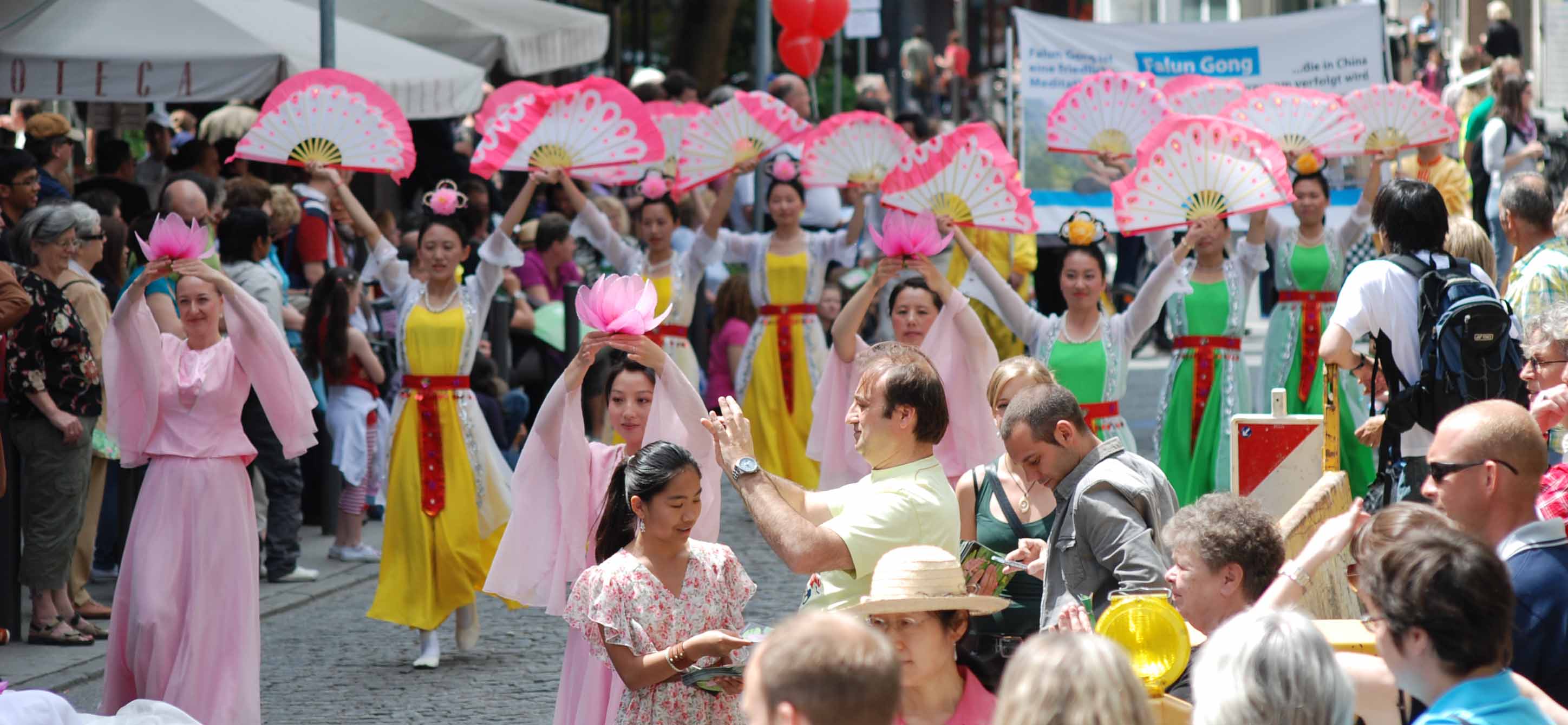 这是第八届法兰克福文化节游行,二零一二年六月二十三日中午,五十多个团体参加了这次主题为“抗议种族主义和边缘化”的活动。游行队伍从 Untermainkai出发,穿过新老城区,最后在市政厅广场结束。由法轮功学员组成的欧洲天国乐团,花车上的功法演示,扇子舞和模拟劳教所展现了法轮大法修炼者的风貌,同时向民众揭露中共对真善忍信仰者的持续迫害。