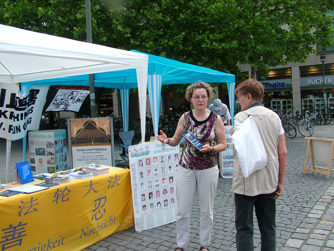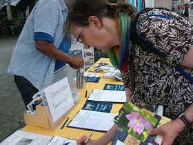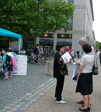 活动当天,学员们用广播的形式揭露活体摘取法轮功学员器官的德语调查报告和相关新闻录音,人们都驻足凝神静听,震惊这人神共愤的星球上最邪恶的罪恶行径。一些人就是听到了录音主动来签字的。