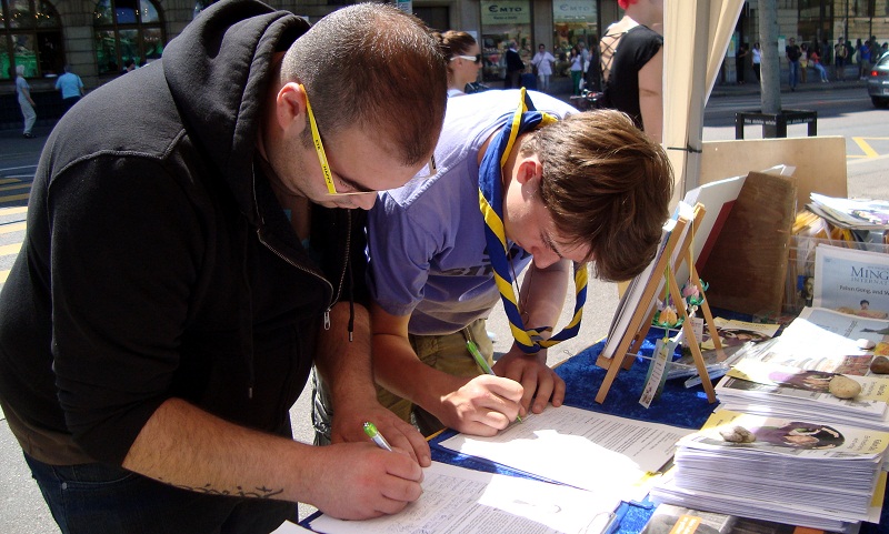 来签名支持法轮功学员反迫害的人中,一对上了年纪的犹太夫妇对法轮功学员被迫害到这种程度感到震惊。他们表示,对这样严重的罪恶,重要的是人们要超越宗教的界限而团结起来,共同制止迫害,因为那是反人类的罪行。