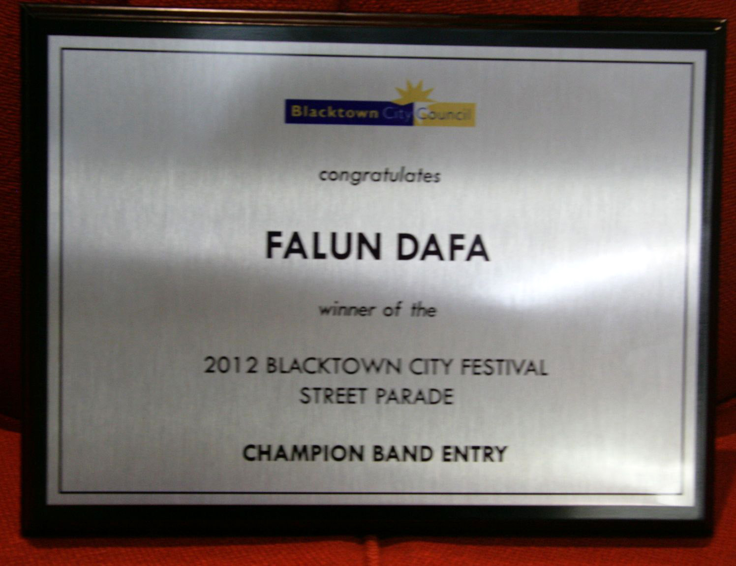 【明慧网二零一二年六月二十九日】(明慧记者蕴韵澳洲悉尼报道)二零一二年六月二十七日晚七点,澳洲悉尼布莱克镇(Blacktown City)市政府为当地节日大游行获奖团体举行颁奖仪式,法轮功团体和法轮功学员组成的天国乐团已是第三次获得冠军。