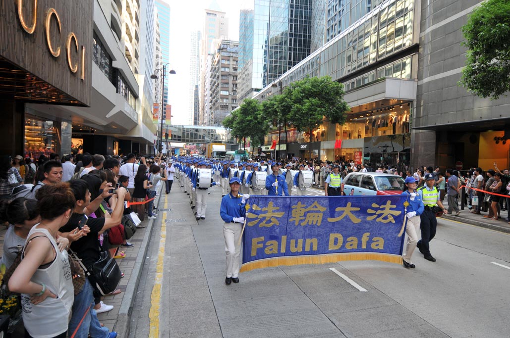 二零一一年七月二十四日,全球声援法轮功反迫害十二年之际,香港法轮功学员及支持团体举行集会游行。