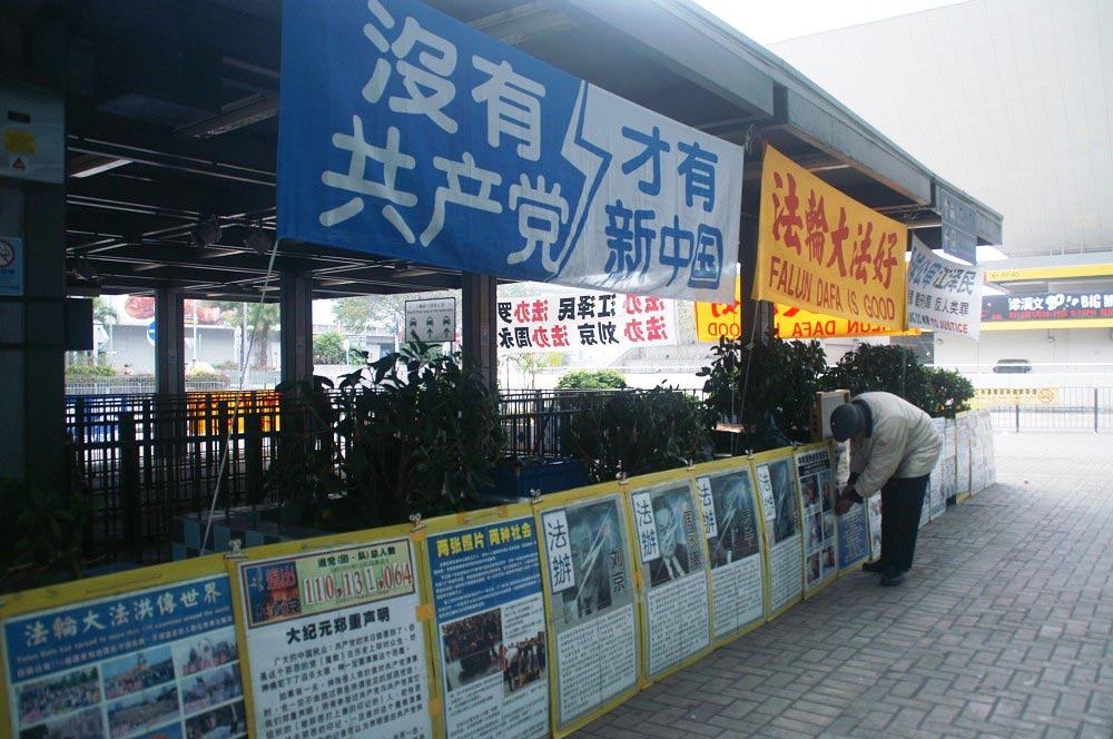 法轮功的真相资料点醒目壮观展示在各旅游景点的旅客候车处,十三个年头,风雨无阻,四千多个日子以来从不打烊。