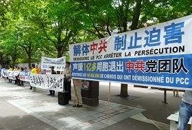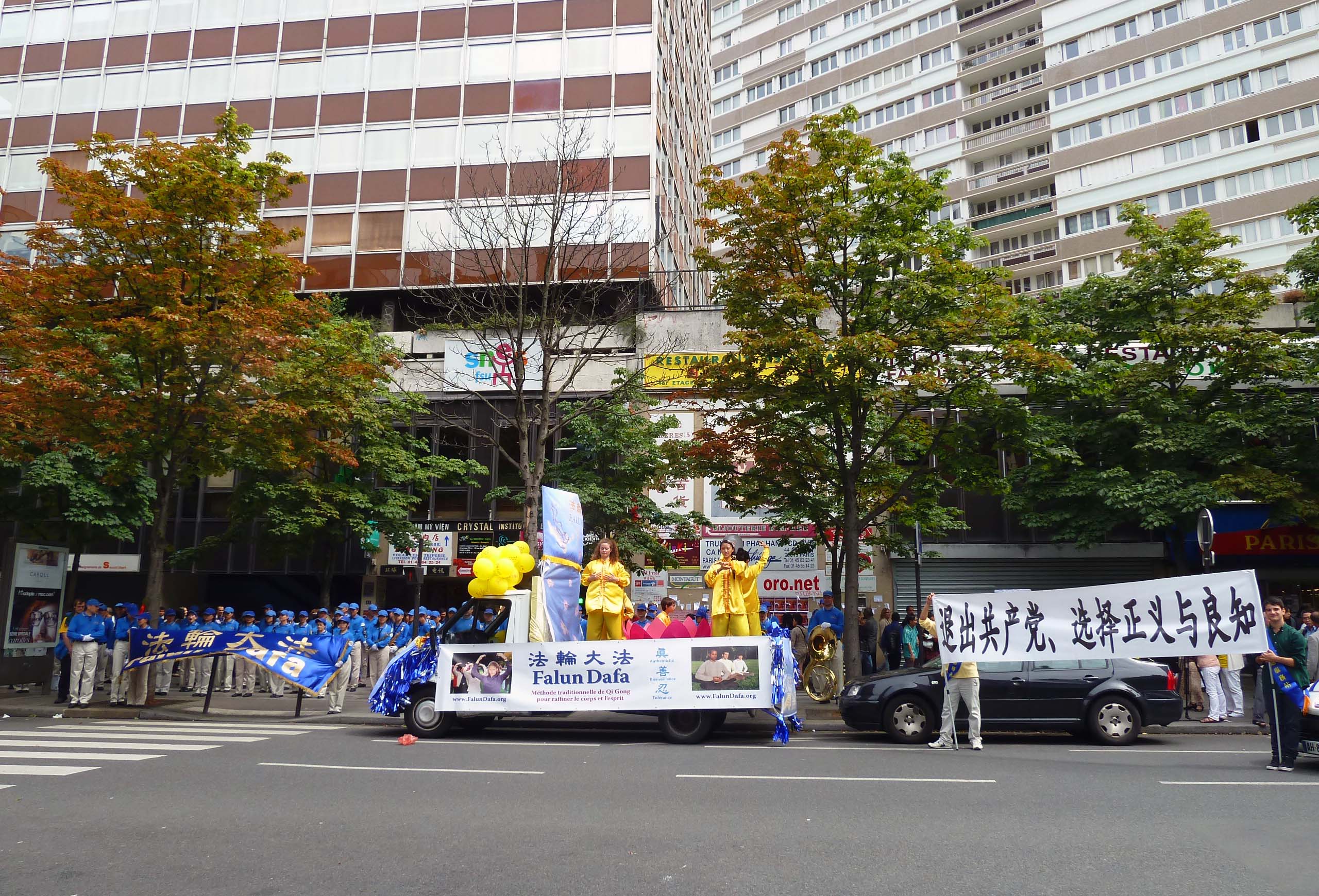 退党服务中心的义工们沿路分发真相资料,很多华人和法国人都接受了真相资料,并对中国发生的迫害法轮功事件表示震惊。同时,中法文交替的横幅真相写着“三退抹兽印,九评洗心尘”、“天意现,中共将亡,传九评,退出共产党、共青团、少先队、抹去毒誓保平安,迎接没有共产党的新纪元”以及“五千年的文明史毁于六十年的中共暴政”等。