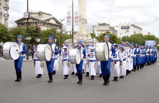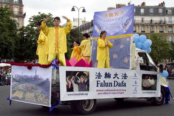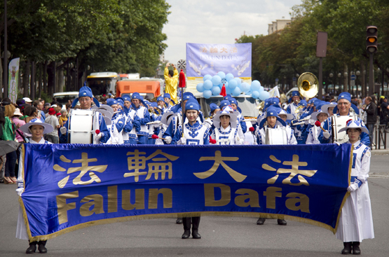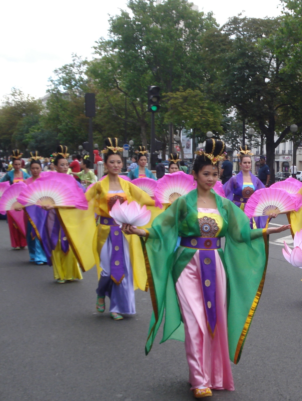与众多团体不同,法轮功以清新的风格出现,典雅的着装,动听的音乐,优美的舞姿,赢得了众多观众的喝彩和掌声。七十多名身着古典宫廷乐服的天国乐团成员,演奏着《法轮大法好》、《法鼓法号震十方》、《送宝》和《欢乐颂》等乐曲,把法轮大法的福音带给巴黎市民和来自世界各地的游客。美丽的仙女,把精美的纸折莲花送给观众,人们都开心的接受,并表示感谢。