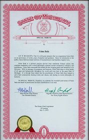 因此,我们特别表示敬意,庆祝法轮大法二十周年,并感谢其修炼者们对密西根州的贡献。