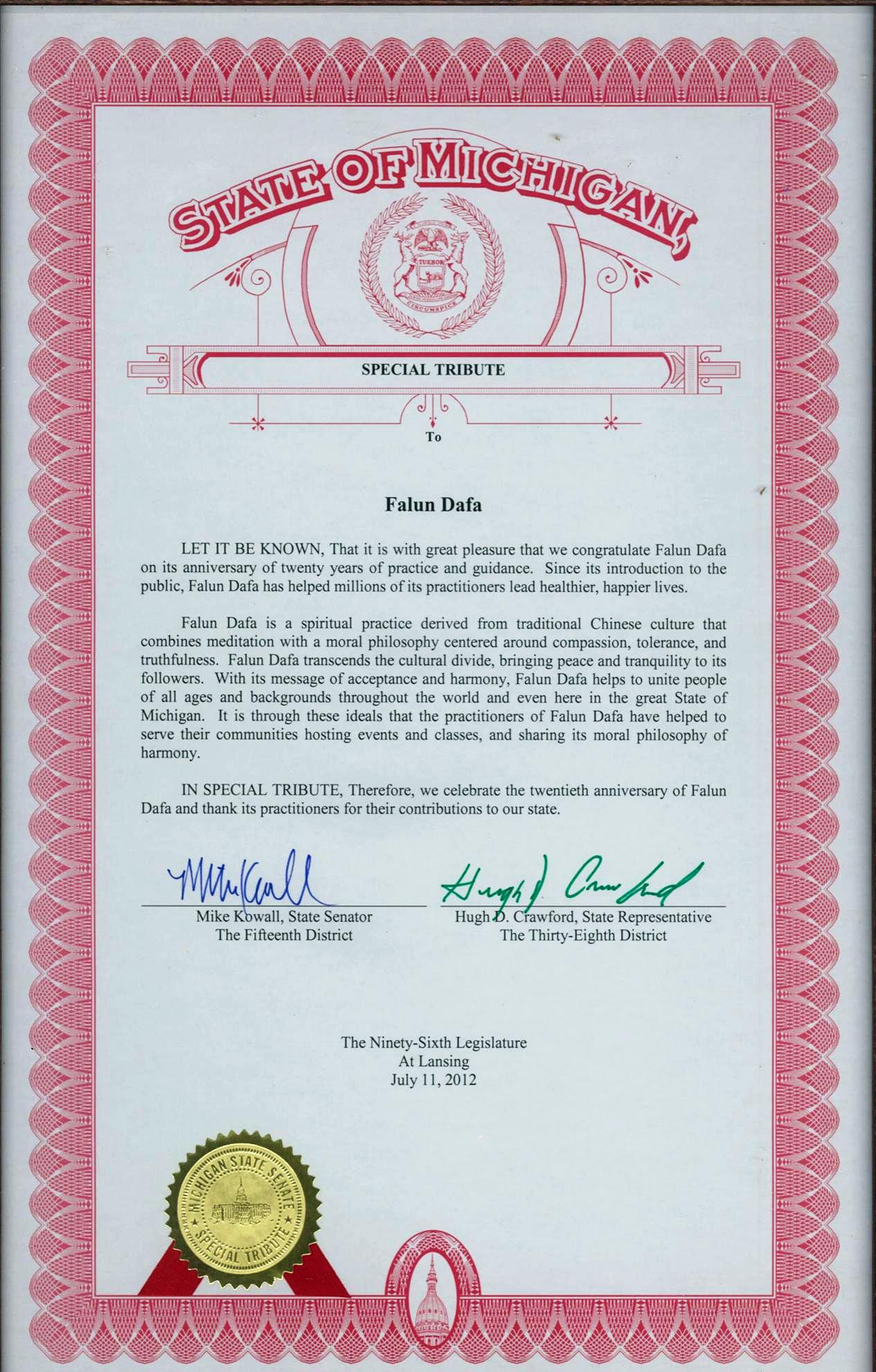 明慧网二零一二年七月十二日(明慧记者徐菁编译报导)二零一二年七月十一日,美国密西根州第十五区参议员麦克.考沃先生(Mike Kowall)和第三十八区州众议员休.克劳福特(Hugh D Crawford)联合签署了一份特别感谢状(Special Tribute to Falun Dafa),以此表彰法轮大法及其修炼者带给世界的贡献。二零一二年是法轮大法洪传二十周年,这也是今年包括底特律市,州府兰辛市在内的,密西根州法轮大法协会收到的第十份表彰信函。