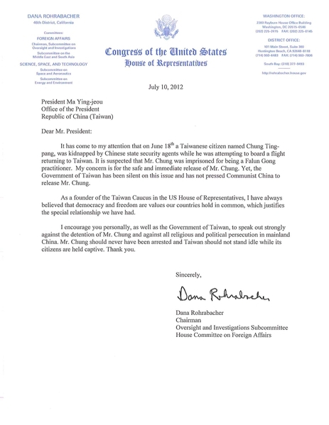 【明慧网二零一二年七月十二日】(明慧记者李慧容综合报道)二零一二年七月十日,美国众议院外交委员会资深众议员、台湾连线创办人罗拉巴克(Dana Rohrabacher)就台湾新竹科技公司经理、法轮功学员钟鼎邦被中共国安绑架一案,致函中华民国总统马英九,措词强烈地表示马英九政府在面对其公民被囚禁时,不该无动于衷,应该发出强烈的反对意见。另外,钟鼎邦女儿钟爱十一日晚启程赴美,将拜会美国议员与国际组织,寻求更多的营救。