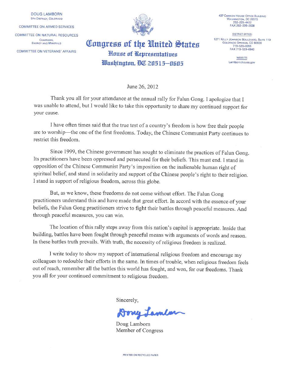 美国科罗拉多州联邦众议员道格•兰伯恩(Doug Lamborn)在二零一二年集会前夕,致函法轮功学员。他说:“谢谢你们参加一年一度的法轮功集会。我为自己无法到场而感到抱歉,但是我希望借此机会来分享我对你们的持续支持。”