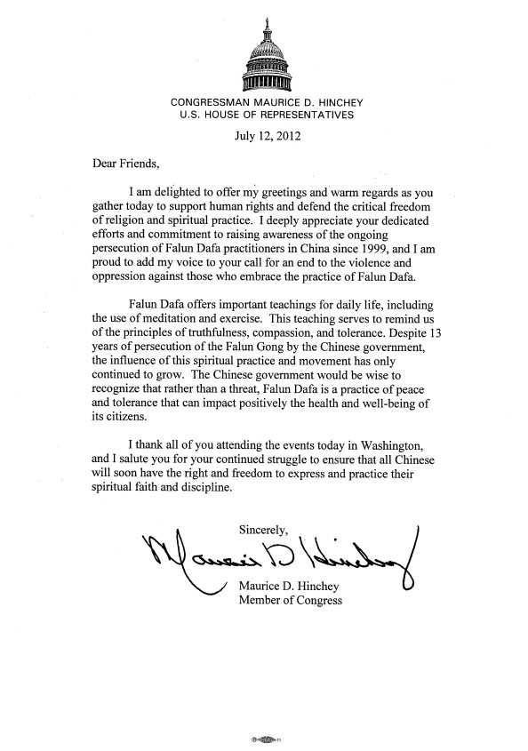 【明慧网二零一二年七月十三日】在法轮功学员反迫害十三周年之际,来自纽约州的美国国会议员默瑞斯•辛契(Maurice D. Hinchey)给法轮功学员在美国华府举行的反迫害集会发来声援信。