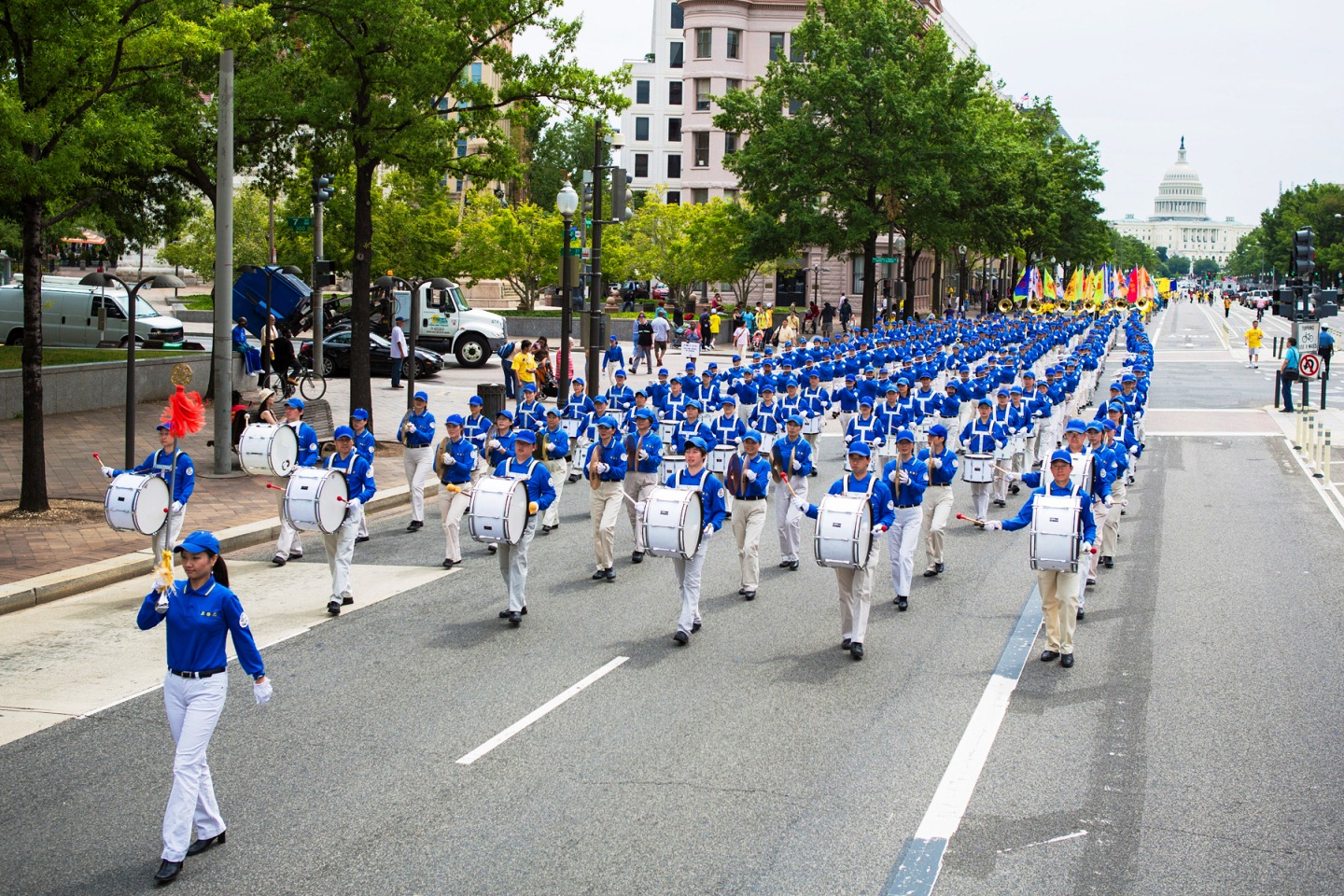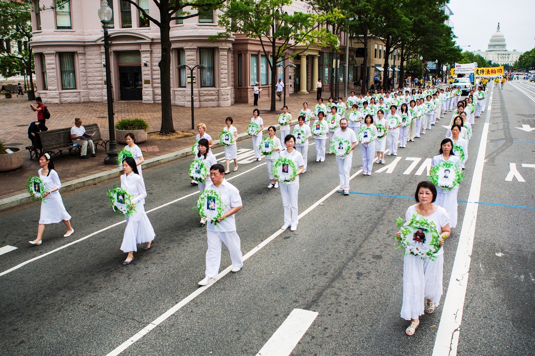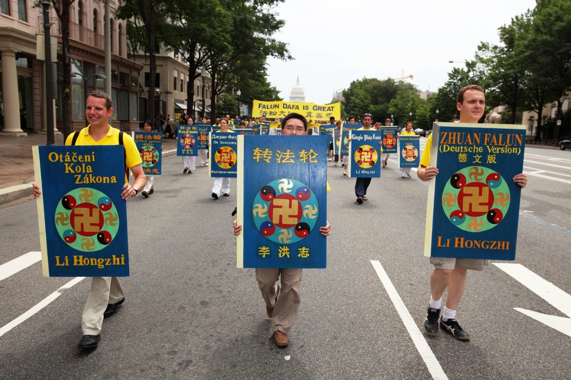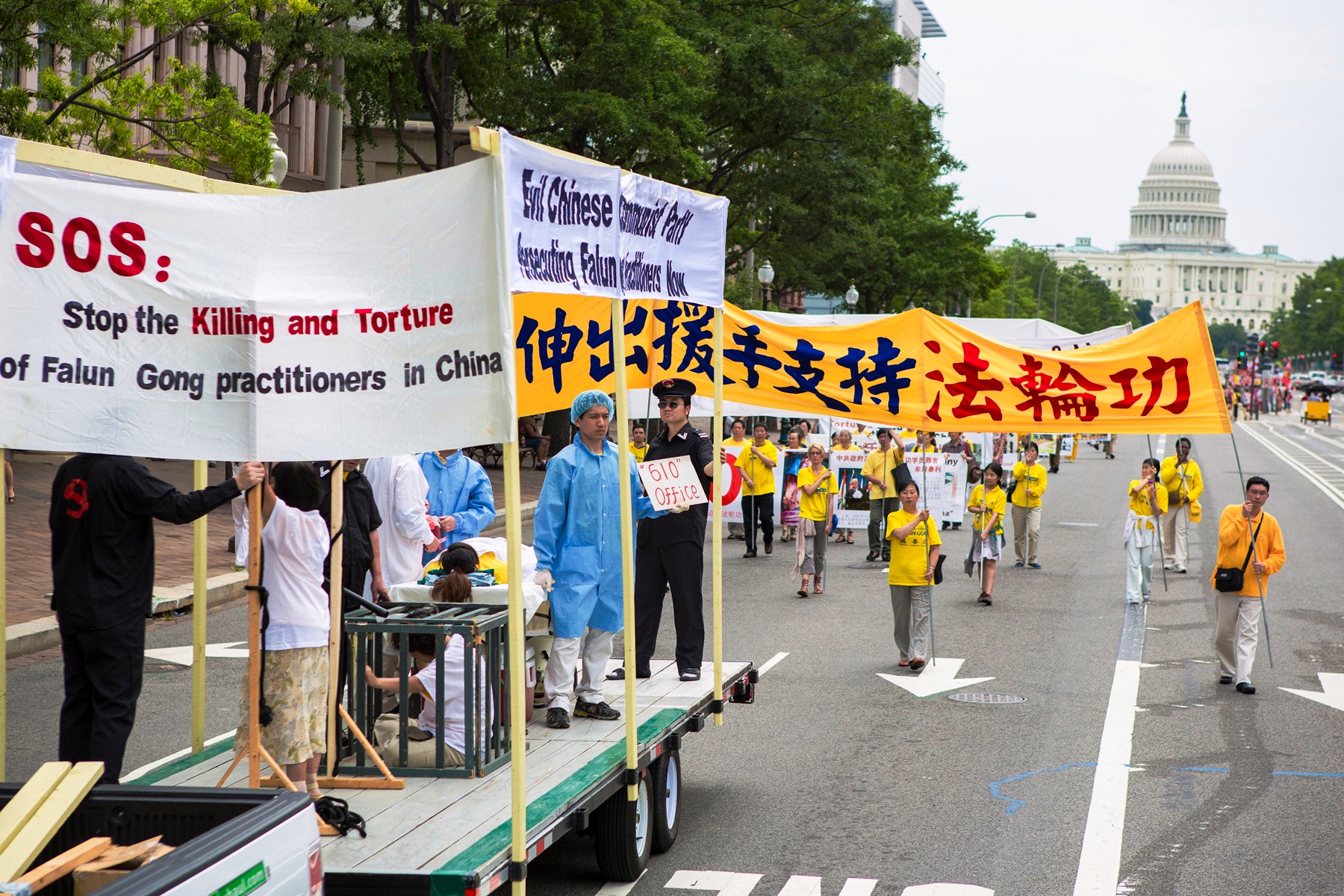 游行队伍分为“大法洪传世界”、“千古奇冤——法轮功受迫害”以及“声援一亿两千万中国民众声明退出邪党及其相关组织”等方阵。“法轮大法好”、“世界需要真善忍”、“制止迫害法轮功”等各种法轮功真相横幅和展板等在美国华盛顿DC宽阔的宾西法尼亚大道筑成了壮观的真相长河。