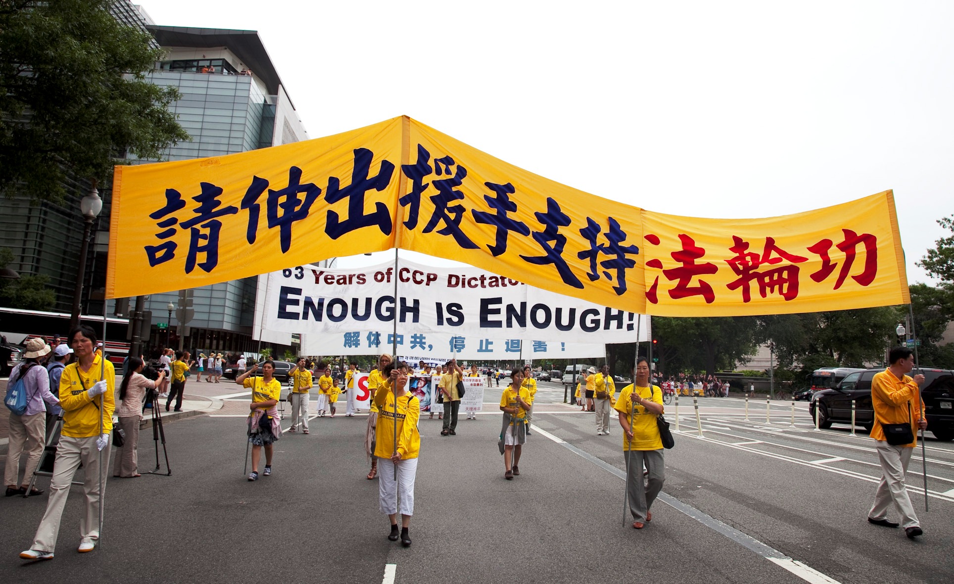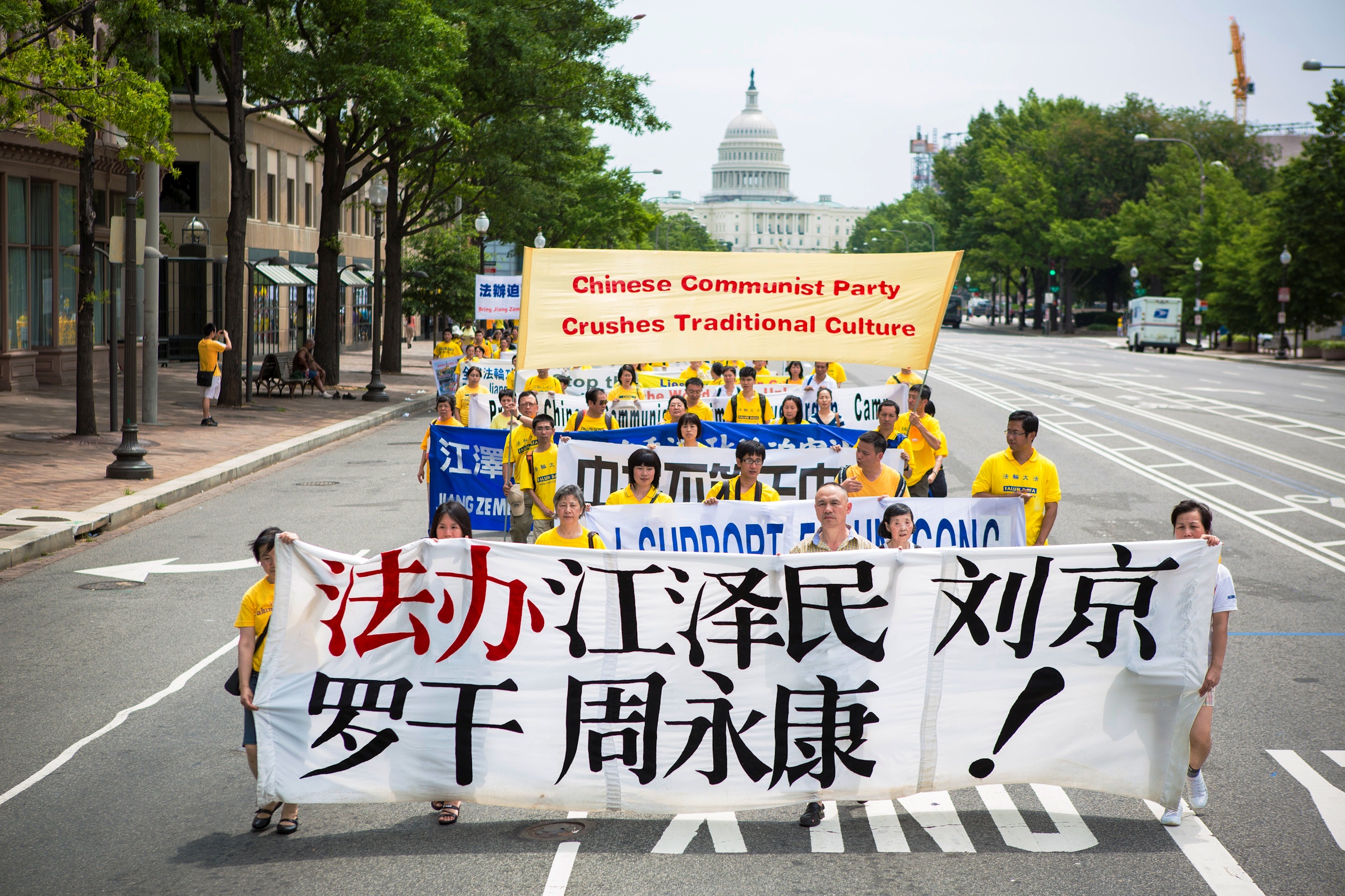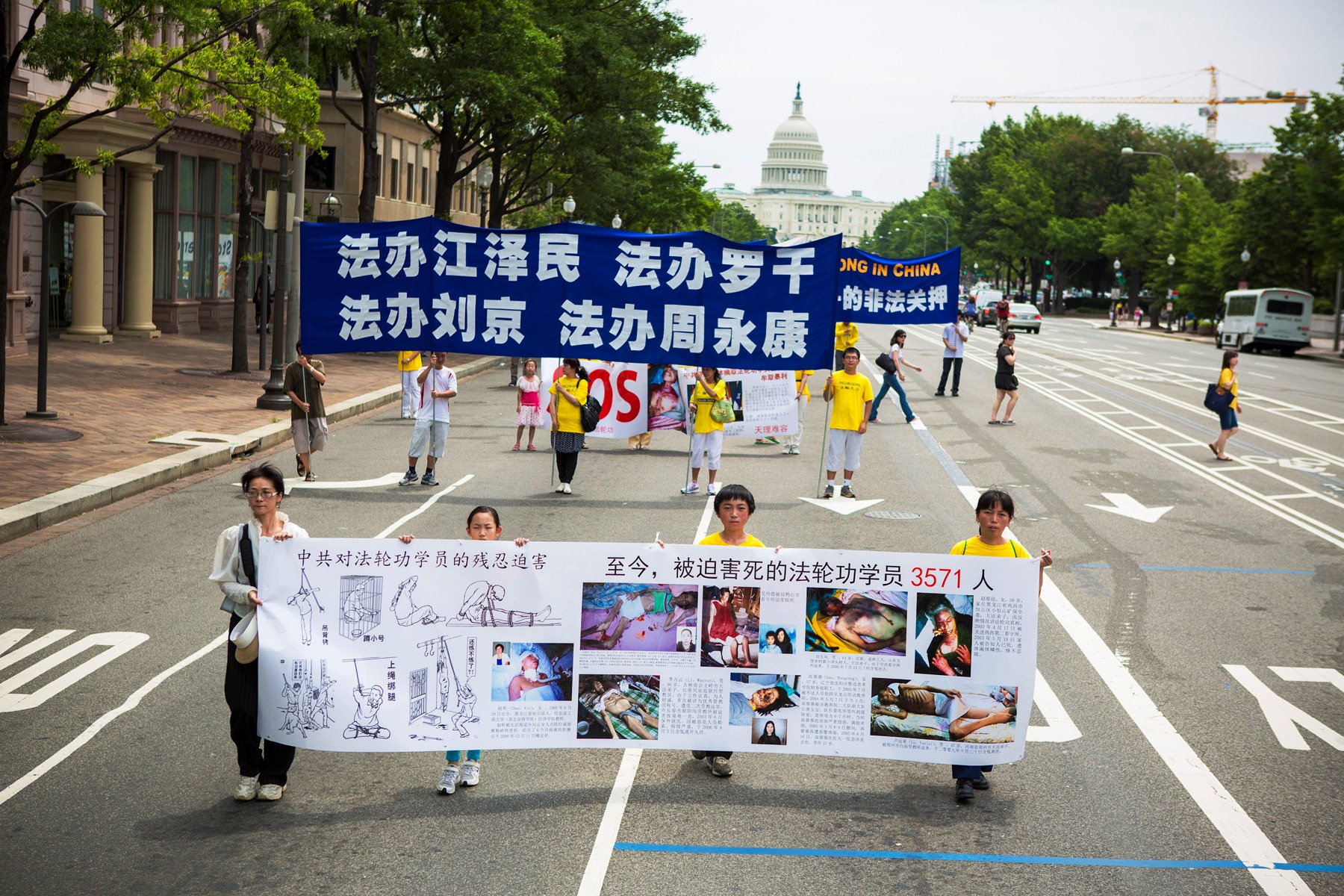 游行队伍分为“大法洪传世界”、“千古奇冤——法轮功受迫害”以及“声援一亿两千万中国民众声明退出邪党及其相关组织”等方阵。“法轮大法好”、“世界需要真善忍”、“制止迫害法轮功”等各种法轮功真相横幅和展板等在美国华盛顿DC宽阔的宾西法尼亚大道筑成了壮观的真相长河。