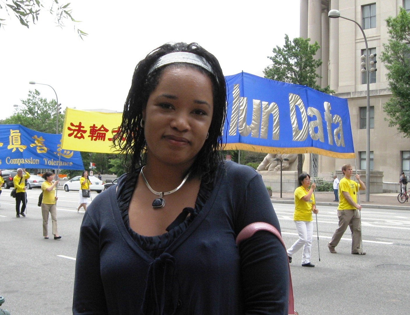 在游行的起点见到一个年轻端庄的女孩,一脸忧郁。她以非常急促的声音讲述了十天前刚刚发生在她家五口人因炼法轮功被中共非法抓捕关押迫害的事情。