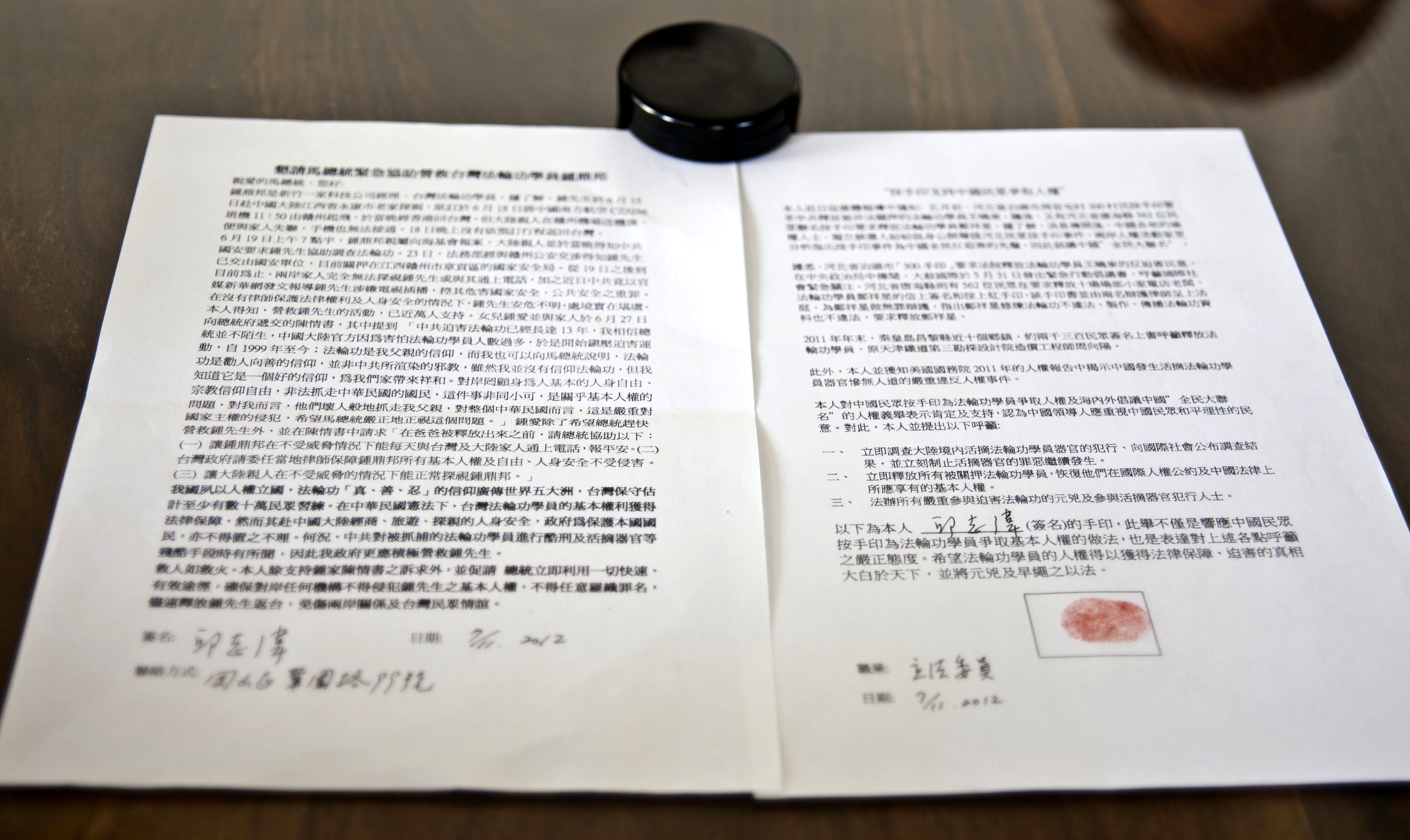 台湾政要按手印 营救钟鼎邦(图)
