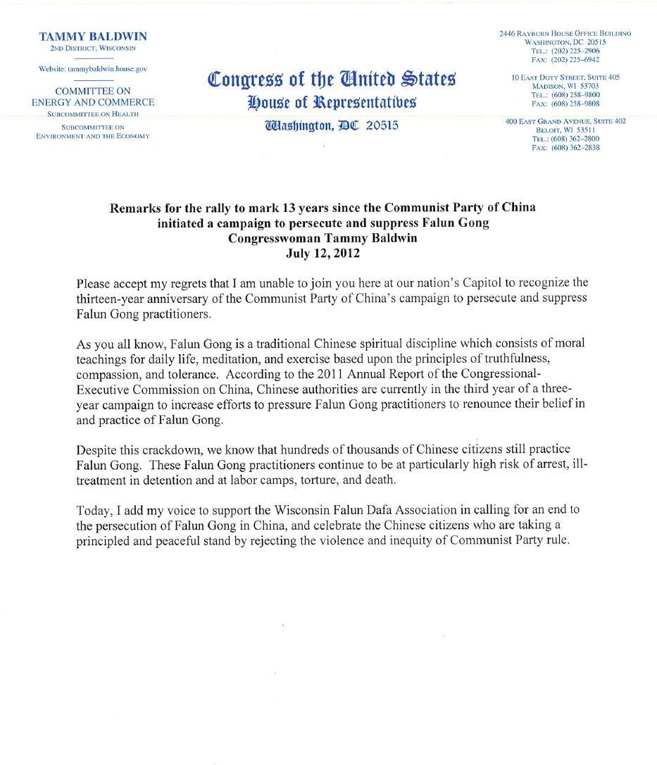【明慧网二零一二年七月十四日】来自威斯康星州第二选区的美国联邦众议员塔米•鲍德温(Tammy Baldwin)日前致函声援法轮功团体,呼吁结束中共对法轮功的迫害