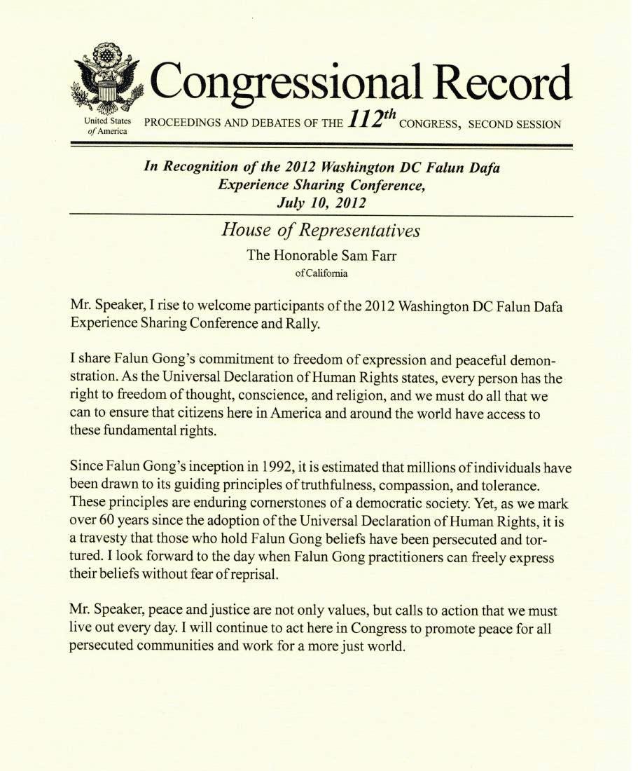 我认同法轮功对自由表达和和平示威的付出。正如国际人权宣言所说,每个人都有权利自由的思考,自由的遵循自己的良知,自由的信仰宗教的权利,我们必须尽我们的全部所能保证在美国和全世界的公民拥有这些基本的权利。