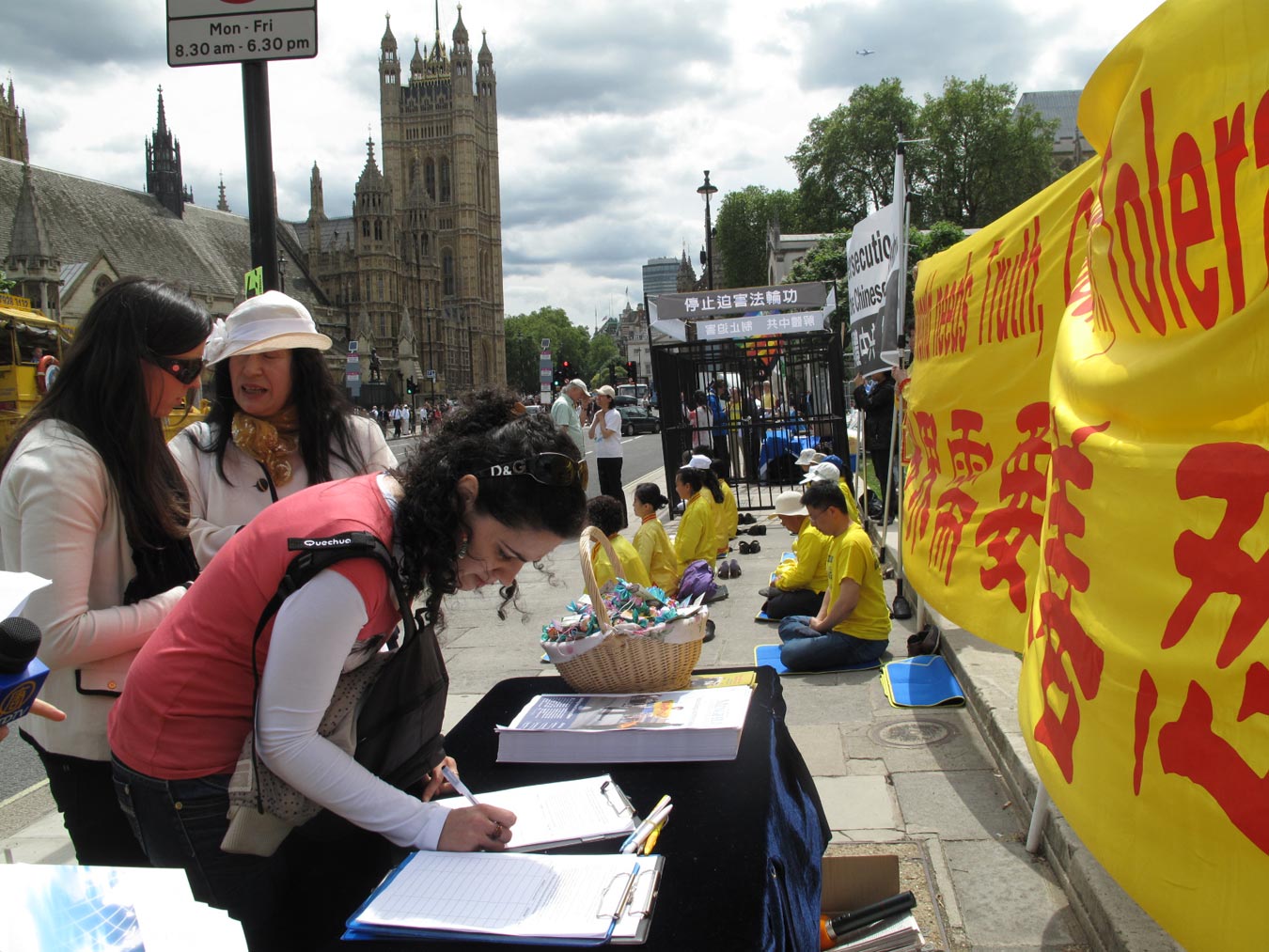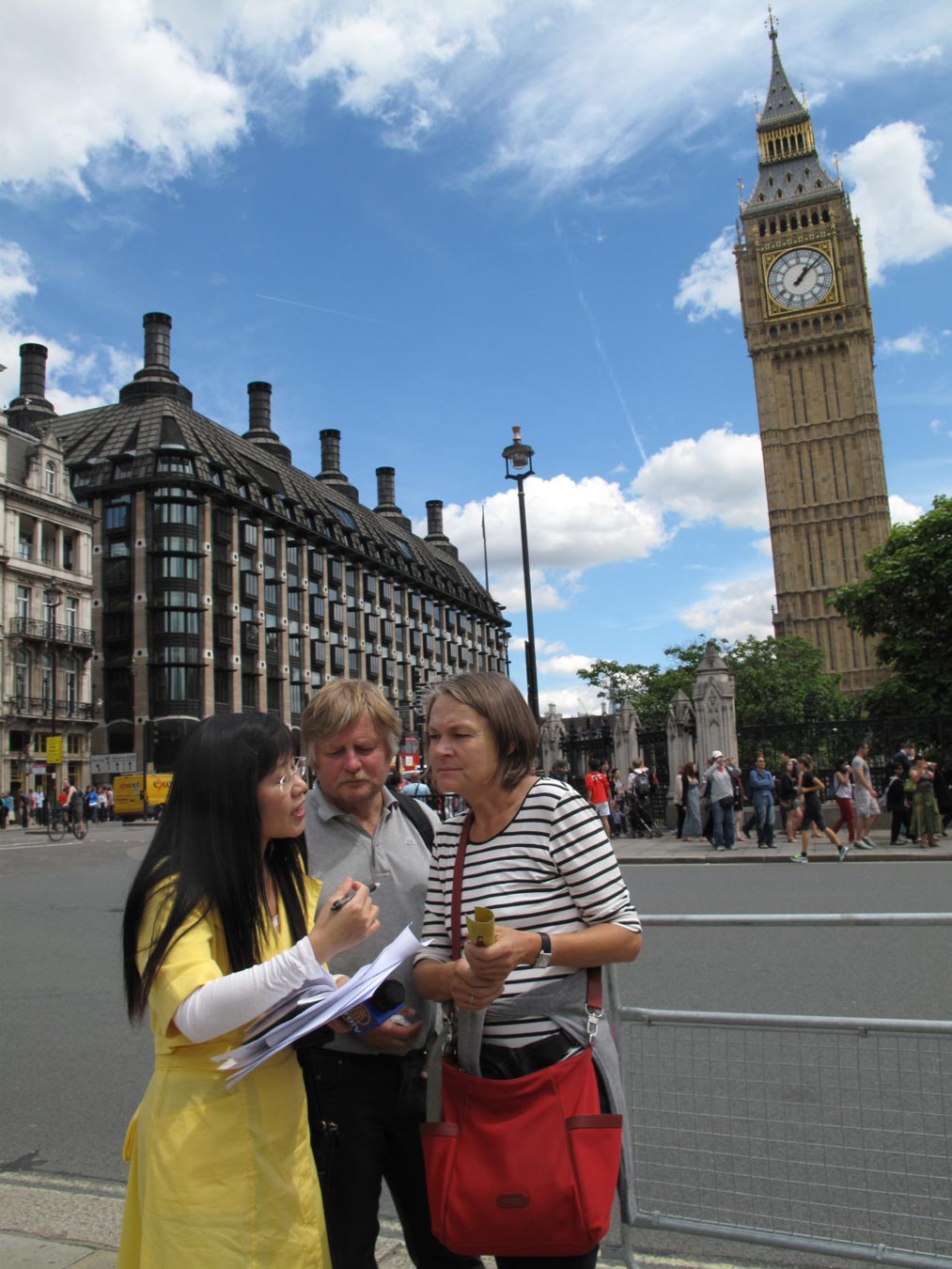 七月十二日这一天,众多前来游览“大本钟”和议会大厦等伦敦著名景点的游客有缘看到了法轮功学员的反迫害集会,这些来自世界各地的游客中有的是第一次听说法轮功,很多人在了解基本真相后立刻在反迫害征签表上签名。