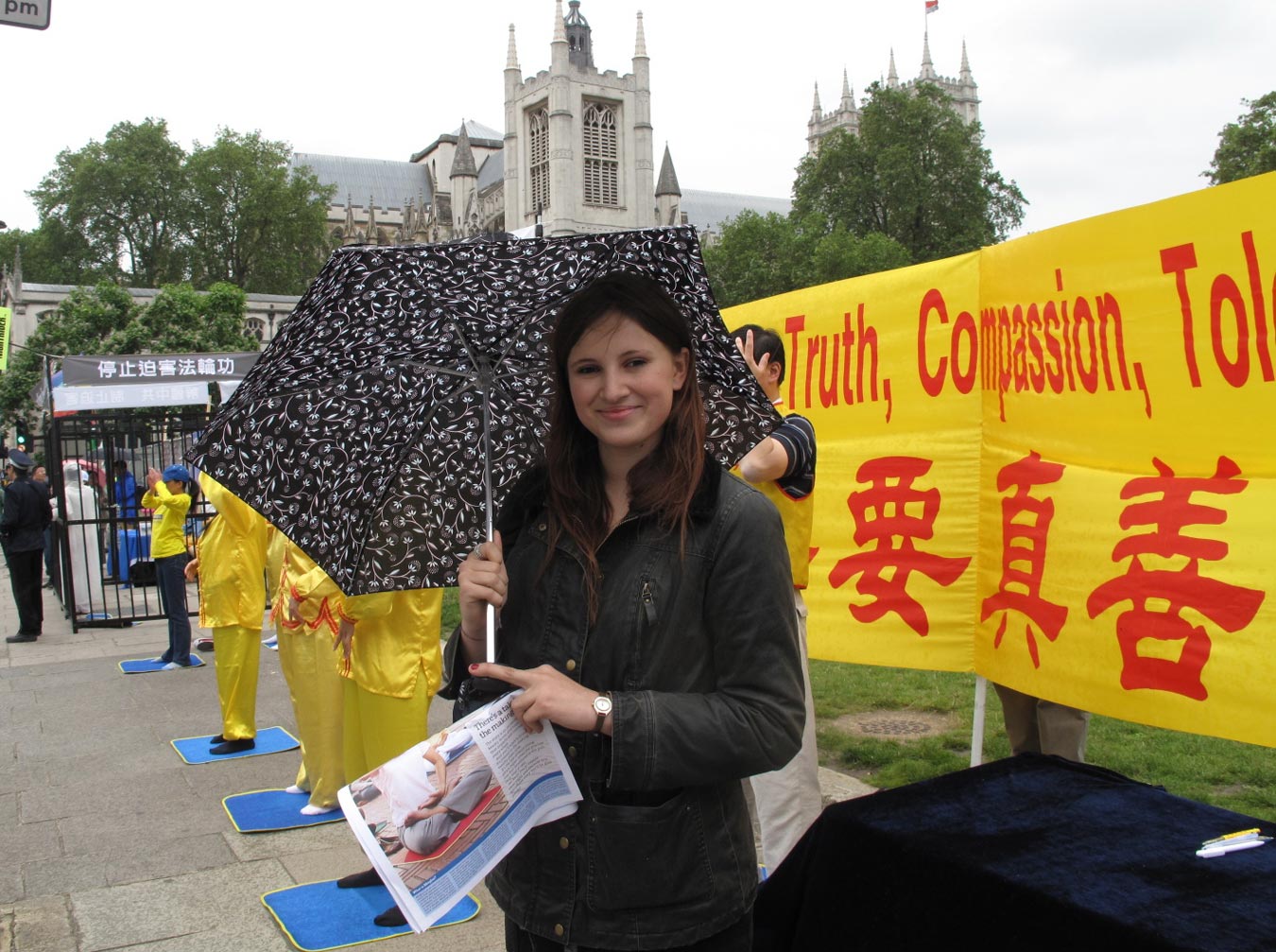 一天的集会快要结束时,伦敦下起了濛濛细雨,法轮功学员坚持在雨中展示真相。一位路过的英国女学生为雨中炼功的场面所吸引,走近法轮功学员了解真相。她说法轮功学员展现的平和能量让她很感动,她有兴趣回家后进一步了解法轮功。