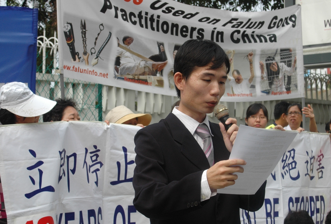 法轮功学员代表郭先生宣读中文文告,文中谴责中共对法轮功学员的迫害:“十三年前,也就是一九九九年七月二十日,中共前党魁江××与中共互相勾结,发起了对法轮功学员的迫害,导致数以千万计的法轮功修炼者被非法拘留、劳教、判刑,酷刑摧残,甚至活体摘取并盗卖法轮功学员的器官,将健康的法轮功学员强行关入精神病院,三千多名法轮功学员被迫害致死,打伤打残者难以计数。亿万法轮功修炼者的亲属、朋友、同事和单位受到株连,全中国人民受到谎言诬陷的‘洗脑’。”